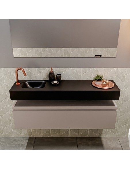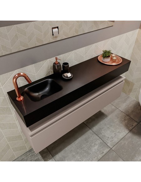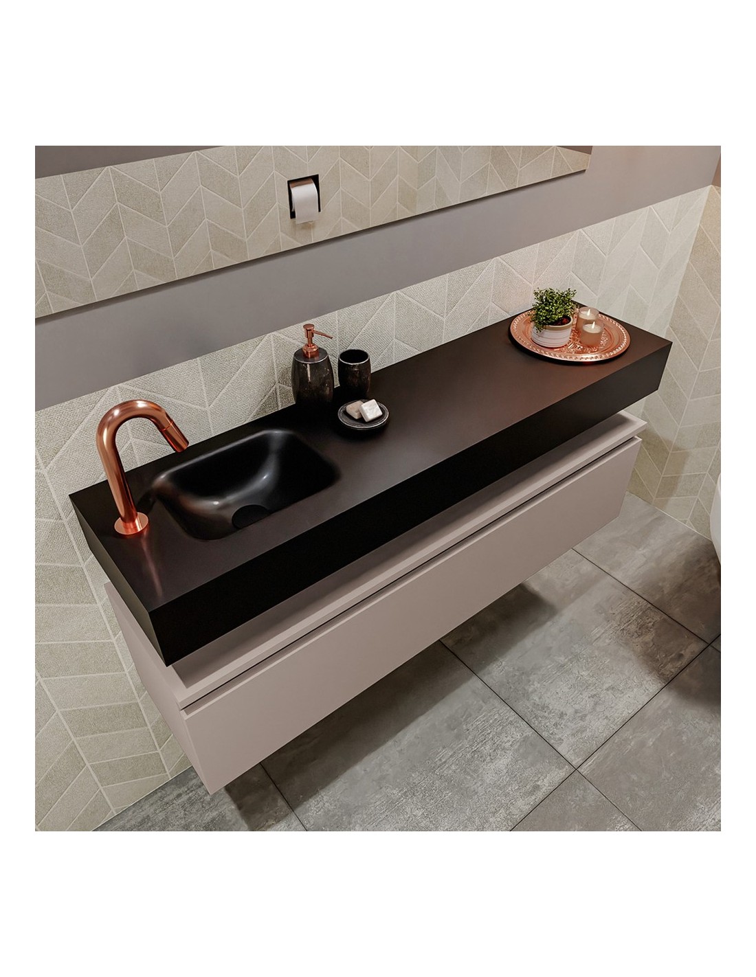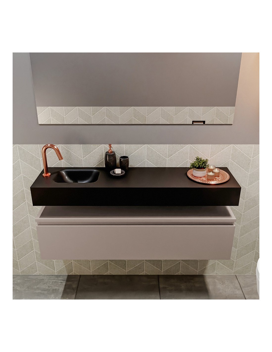 ANDOR Komplet badmiljø med venstrevendt håndvask til bordmonteret armatur. Badmiljøet kommer med 1 skuffe med fuldt udtræk, og er fremstillet i MDF. Håndvasken er fremstillet i sort solid surface. Badmiljøet måler 120 cm i bredden. Det viste armatur medfølger ikke i sættet.