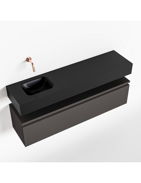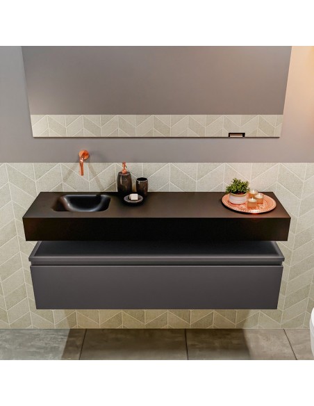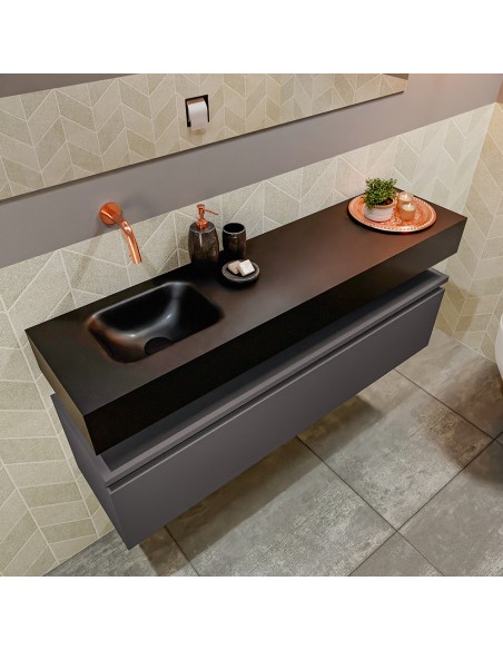 ANDOR Komplet badmiljø med venstrevendt håndvask til vægmonteret armatur. Badmiljøet kommer med 1 skuffe med fuldt udtræk, og er fremstillet i MDF. Håndvasken er fremstillet i sort solid surface. Badmiljøet måler 120 cm i bredden. Det viste armatur medfølger ikke i sættet.