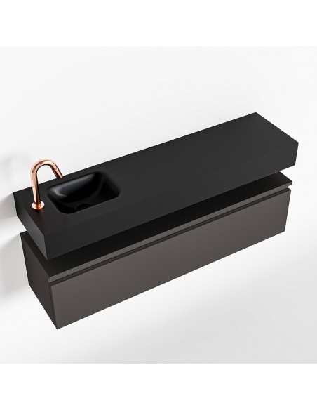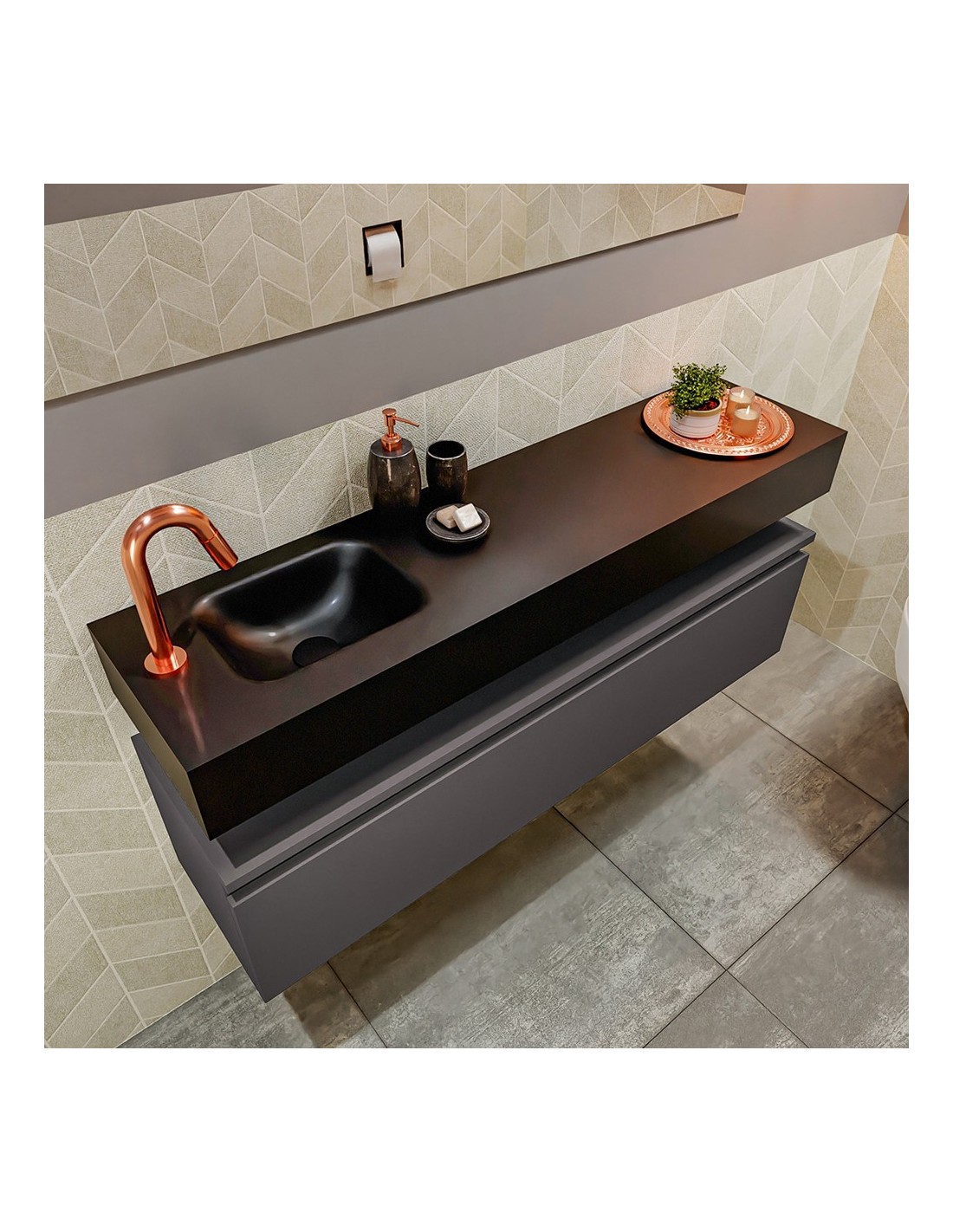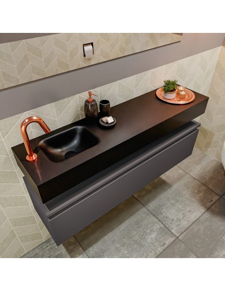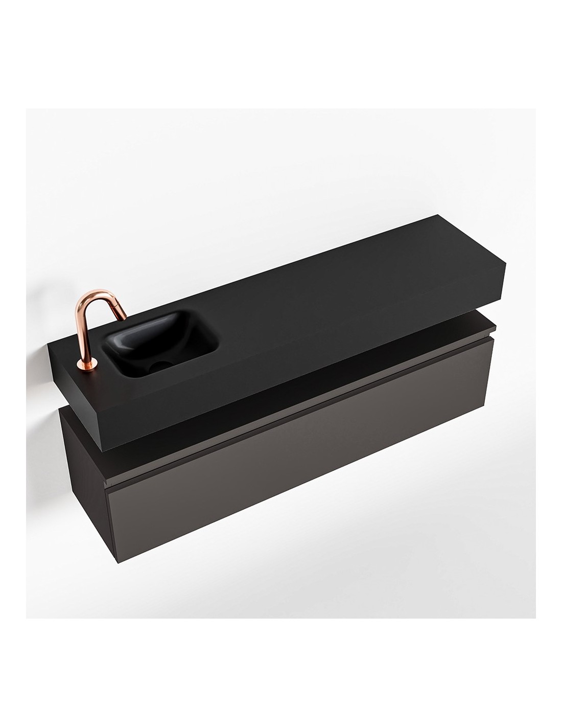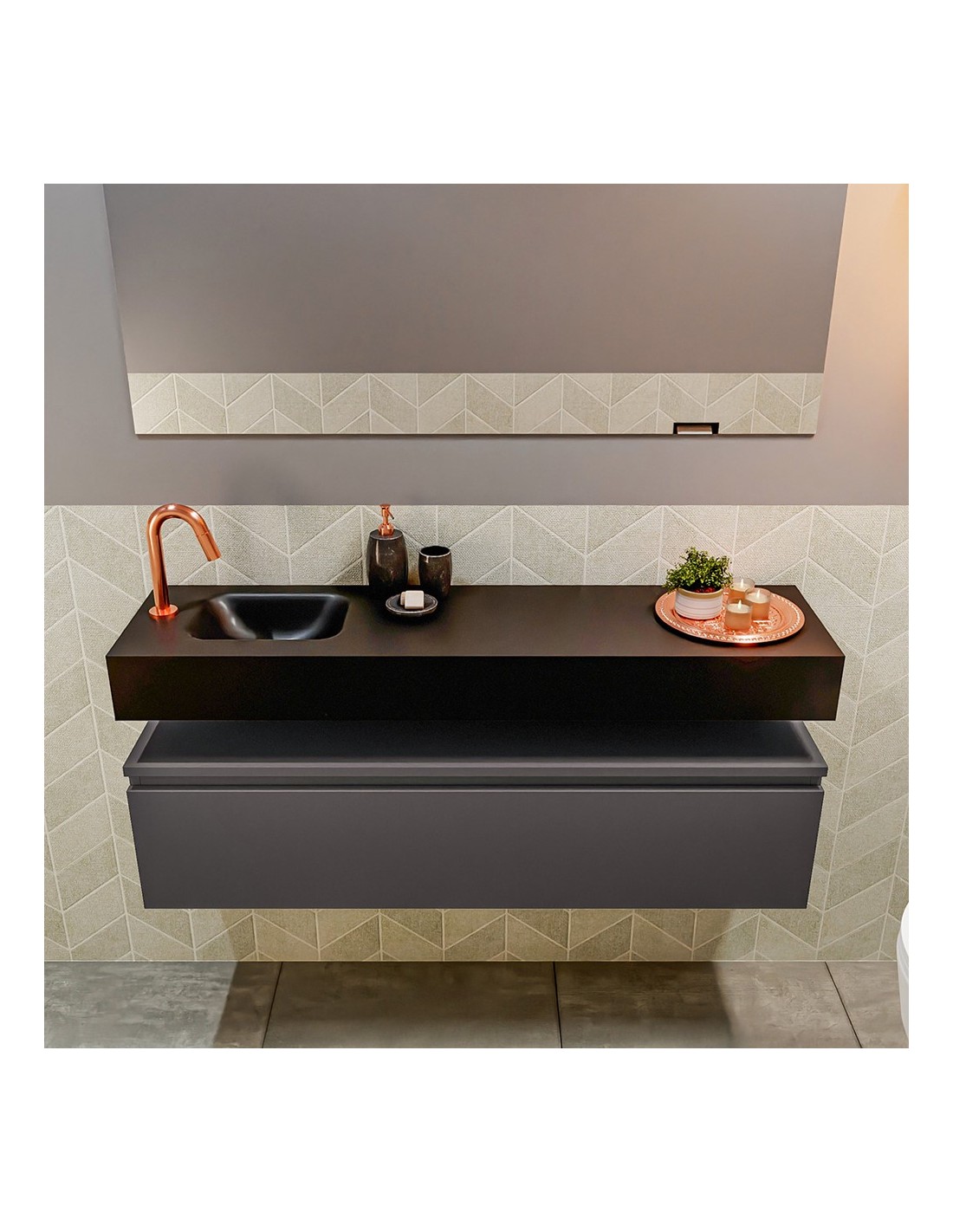 ANDOR Komplet badmiljø med venstrevendt håndvask til bordmonteret armatur. Badmiljøet kommer med 1 skuffe med fuldt udtræk, og er fremstillet i MDF. Håndvasken er fremstillet i sort solid surface. Badmiljøet måler 120 cm i bredden. Det viste armatur medfølger ikke i sættet.