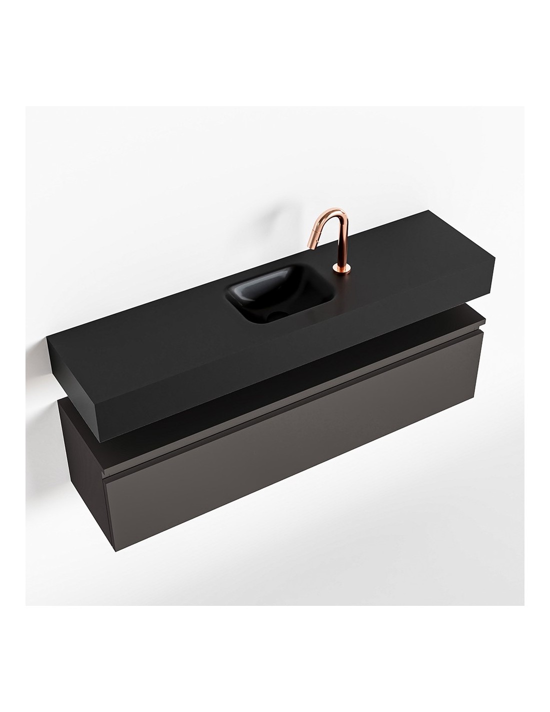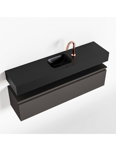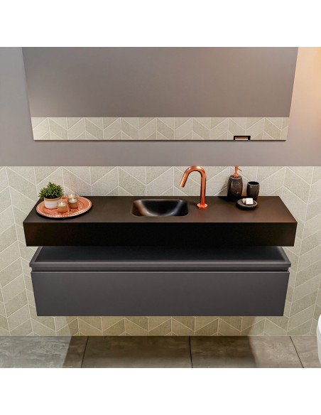 ANDOR Komplet badmiljø med midt centreret håndvask til bordmonteret armatur. Badmiljøet kommer med 1 skuffe med fuldt udtræk, og er fremstillet i MDF. Håndvasken er fremstillet i sort solid surface. Badmiljøet måler 120 cm i bredden. Det viste armatur medfølger ikke i sættet.
