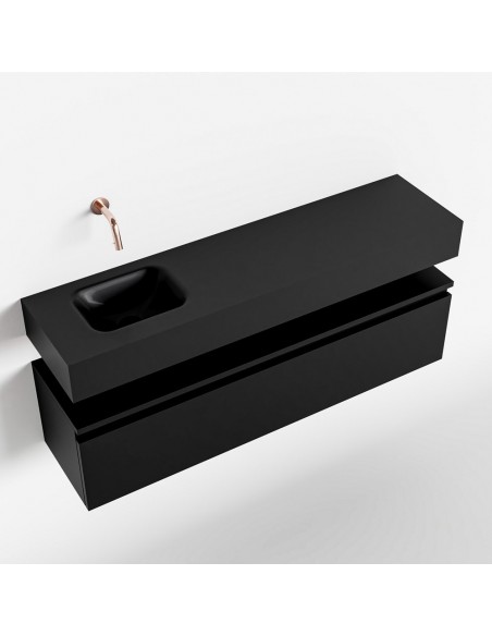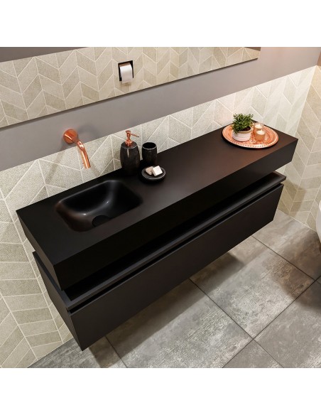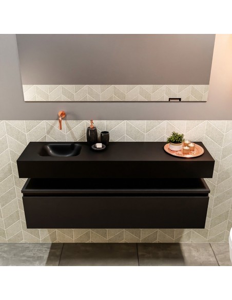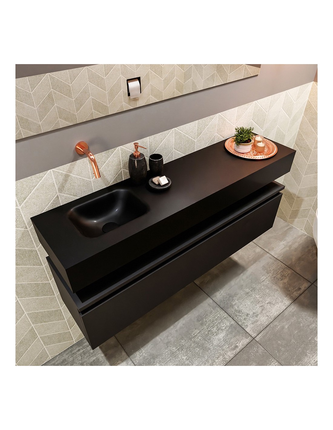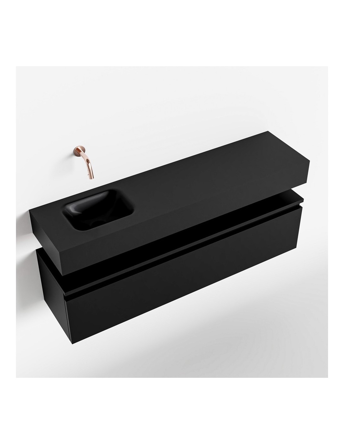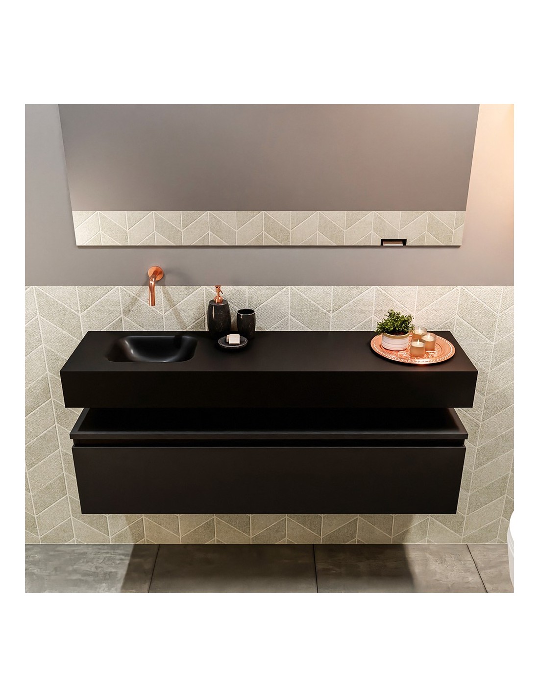 ANDOR Komplet badmiljø med venstrevendt håndvask til vægmonteret armatur. Badmiljøet kommer med 1 skuffe med fuldt udtræk, og er fremstillet i MDF. Håndvasken er fremstillet i sort solid surface. Badmiljøet måler 120 cm i bredden. Det viste armatur medfølger ikke i sættet.