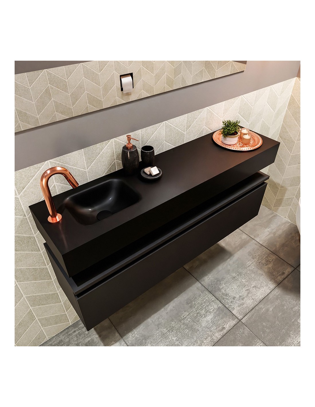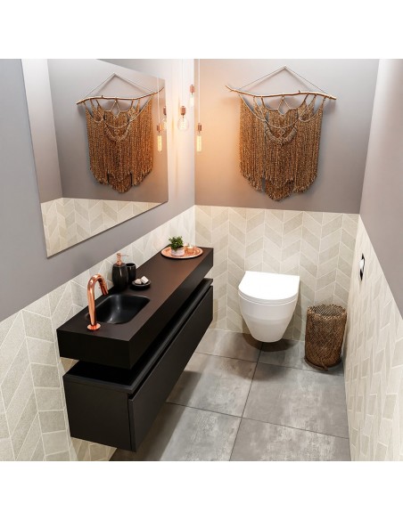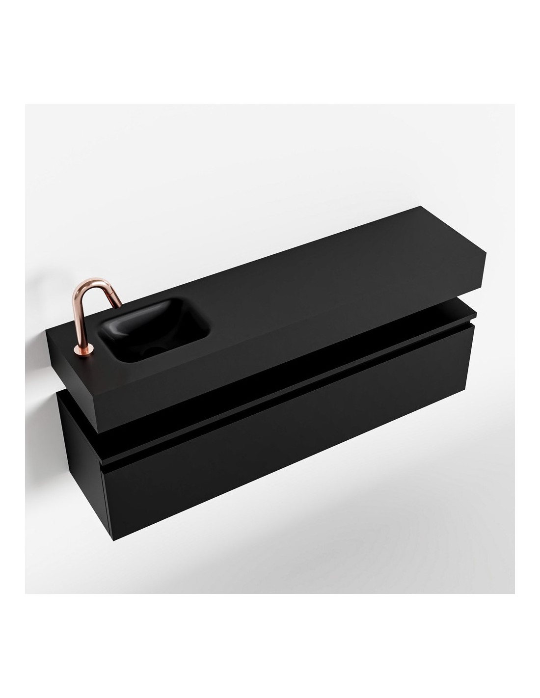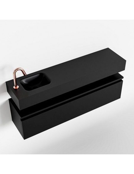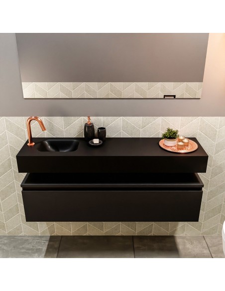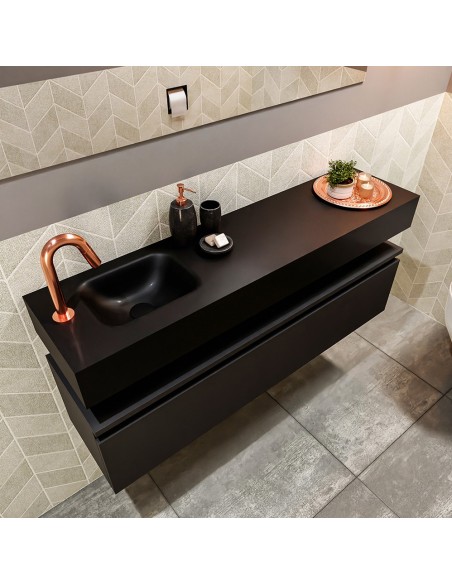 ANDOR Komplet badmiljø med venstrevendt håndvask til bordmonteret armatur. Badmiljøet kommer med 1 skuffe med fuldt udtræk, og er fremstillet i MDF. Håndvasken er fremstillet i sort solid surface. Badmiljøet måler 120 cm i bredden. Det viste armatur medfølger ikke i sættet.