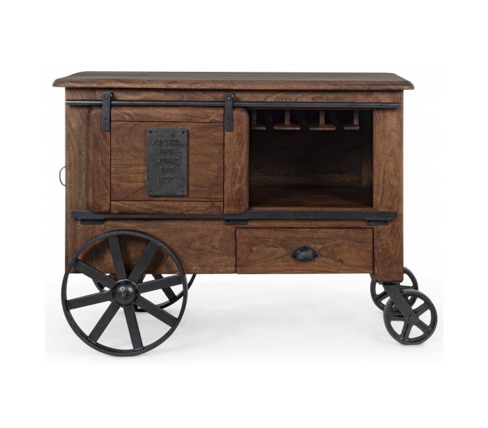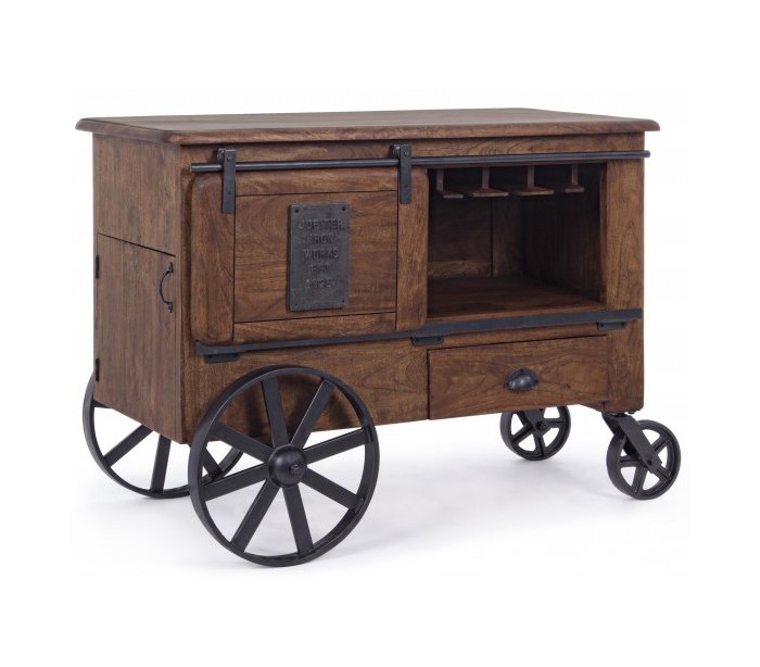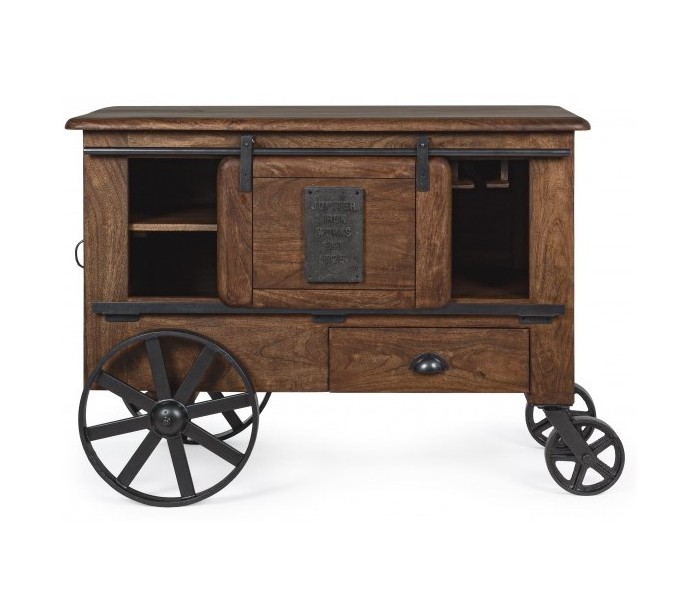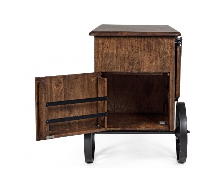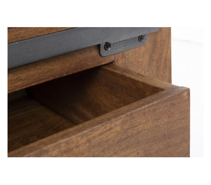 Kabinet bord i et rustikt design, fremstillet i mangotræ og jern. Der er i kabinettet flere opbevaringsmuligheder, skuffe og skab, der giver optimal opbevaringsmulighed. Bordet måler 89 cm i højden og 122 x 58 cm i bredde og dybde.