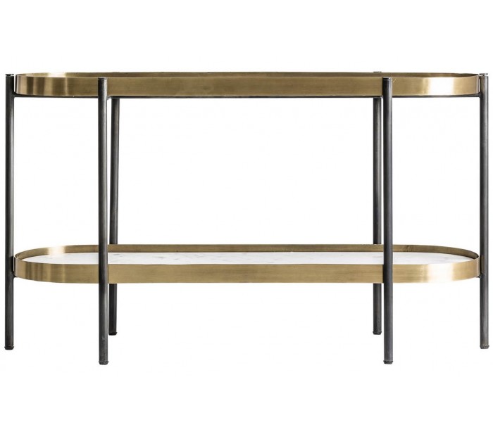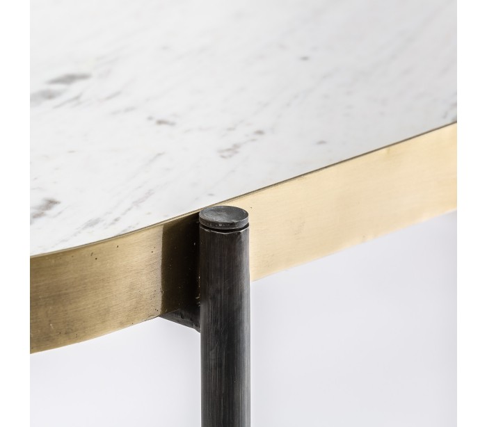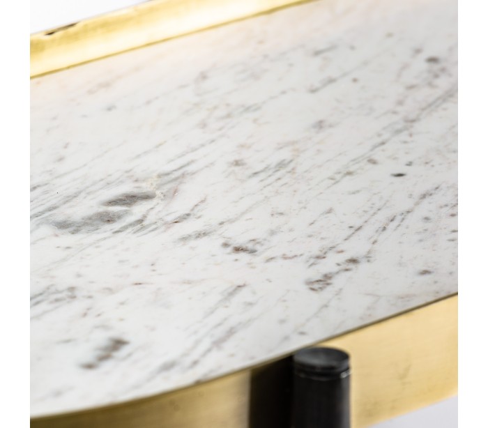 Konsolbord i et moderne design, fremstillet i guld og antik sortlakeret stål, og med bordplade i hvid marmor. Konsolbordet måler 77 cm i højden og 137 cm i bredden.