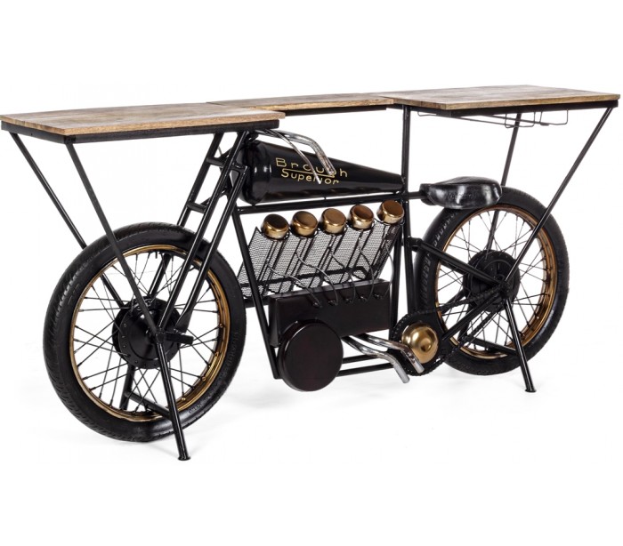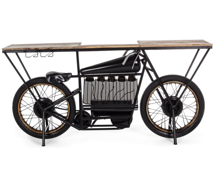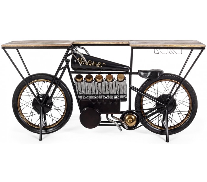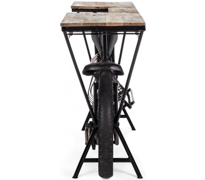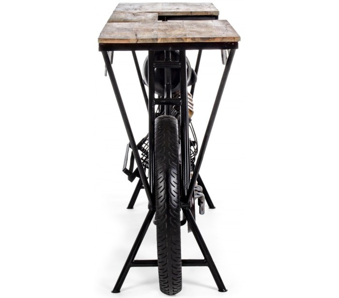 Konsolbord i et industrielt design, fremstillet i metal og mangotræ. Konsolbordet måler 89 cm i højden og 183 x 43 cm i bredde og dybde.