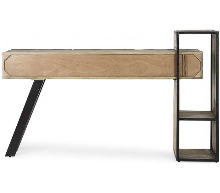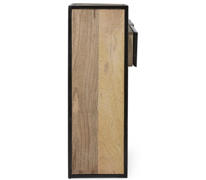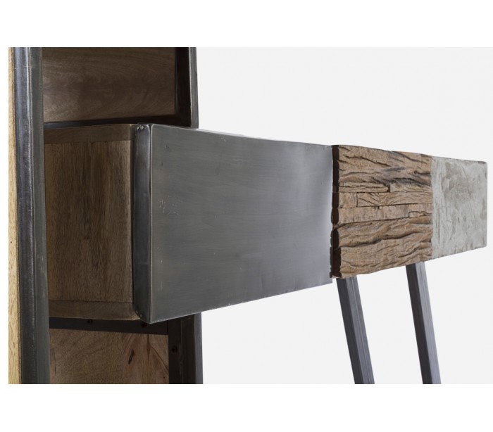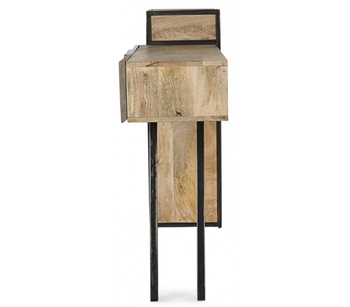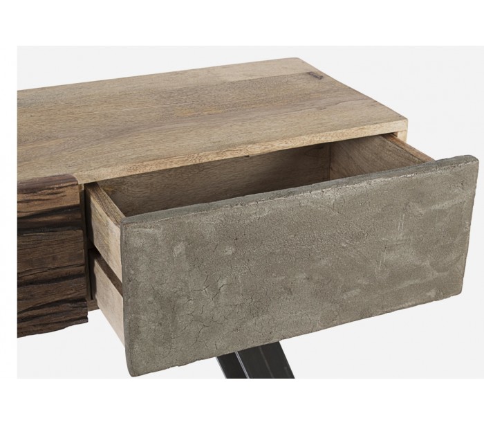 Konsolbord i et rustikt design, fremstillet i mangotræ med skuffefronter i træ, fibercement og stål. Konsolbordet måler 95 cm i højden og 160 cm i bredde og 38 cm i dybde.