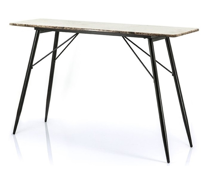 Konsolbord i et moderne design, fremstillet i brun marmor og med stel i sortlakeret jern. Konsolbordet måler 120 x 36 cm i bredde og dybde.