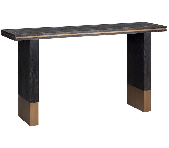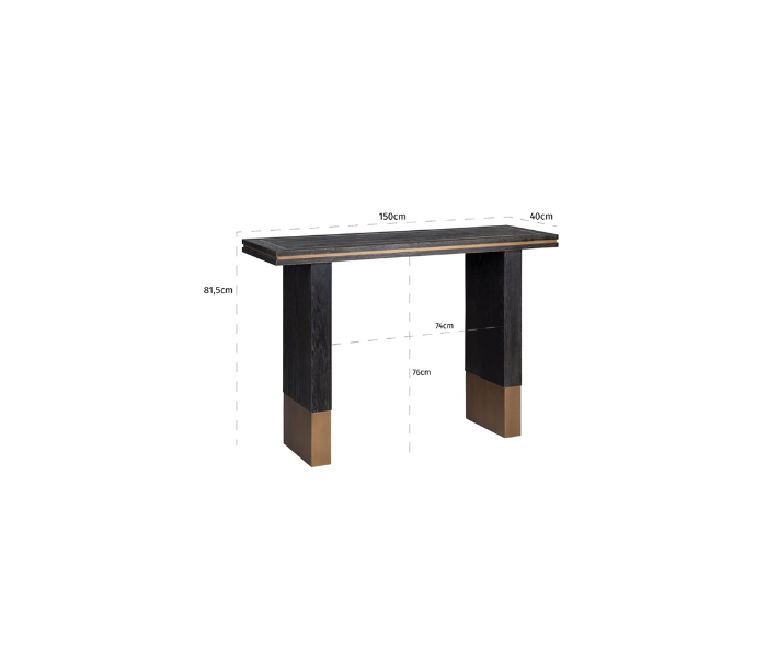 Konsolbord i et design fra hollandske Richmond Interiors. Konsolbordet er fremstillet i sort egetræsfinér og antik guldfarvet stål og måler 150 x 40 cm i bredde og dybde og 81,5 cm i højden.