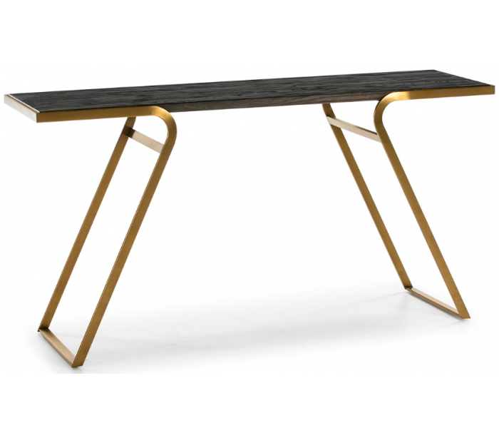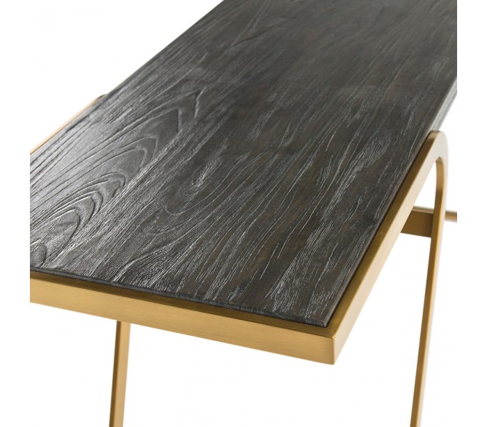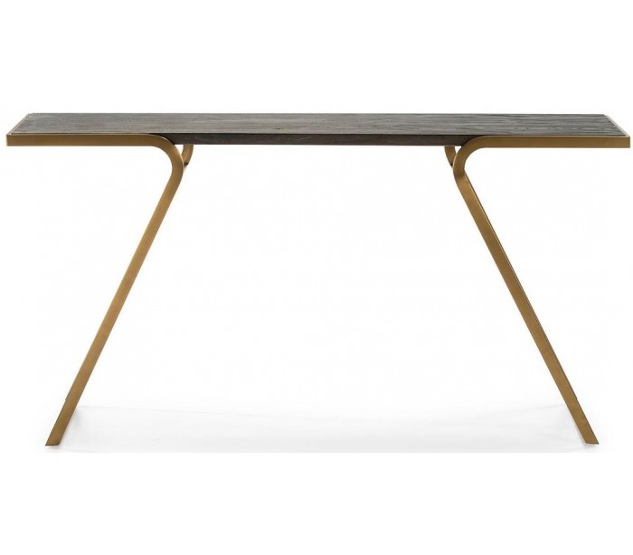 Konsolbord udført i et rustikt design med stel i antik guldfarvet stål og med bordplade i mørkebrun lakeret træ. Konsolbordet måler 79 cm i højden og 152 x 42 cm i bredde og dybde.