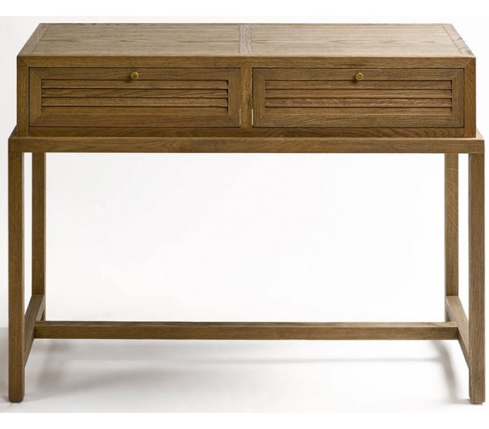 Konsolbord udført i et rustikt design i børstet egetræ og antik guldfarvet metal. Konsolbordet er med 2 skuffer og måler 75 cm i højden og 100 cm i bredden.