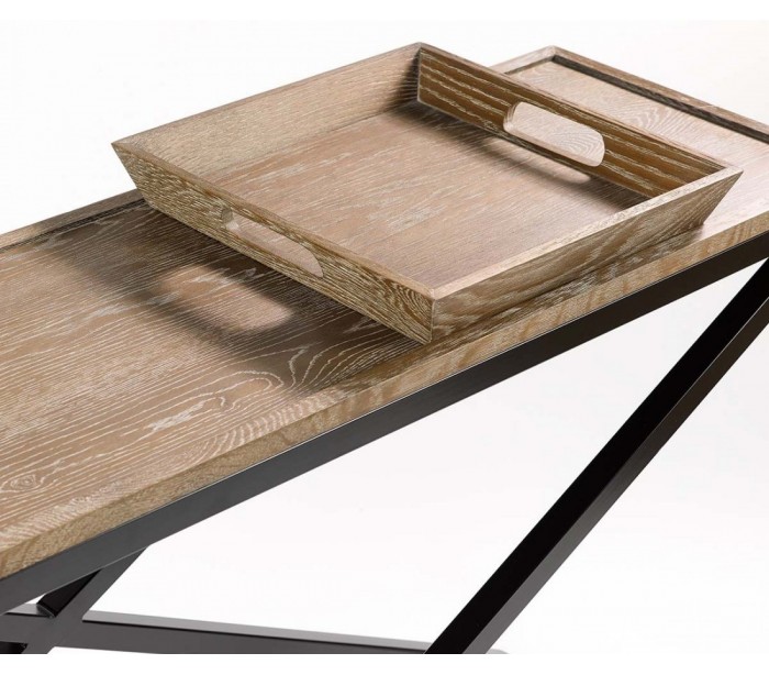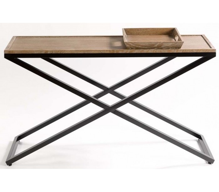Konsolbord udført i et rustikt design i antik sortlakeret metal og pigmenteret aldret egetræ. Konsolbordet måler 140 cm i bredden og 85 cm i højden (inklusiv bakke). Bakken kan tages af.