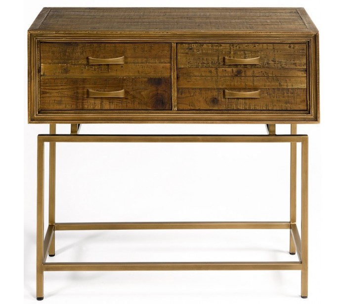Konsolbord udført i et rustikt design i brunbejset genanvendt fyrretræ og antik guldfarvet metal. Konsolbordet er med 2 skuffer, med udseende af 4 skuffer. Møblet måler 90 cm i bredden og 85 cm i højden.