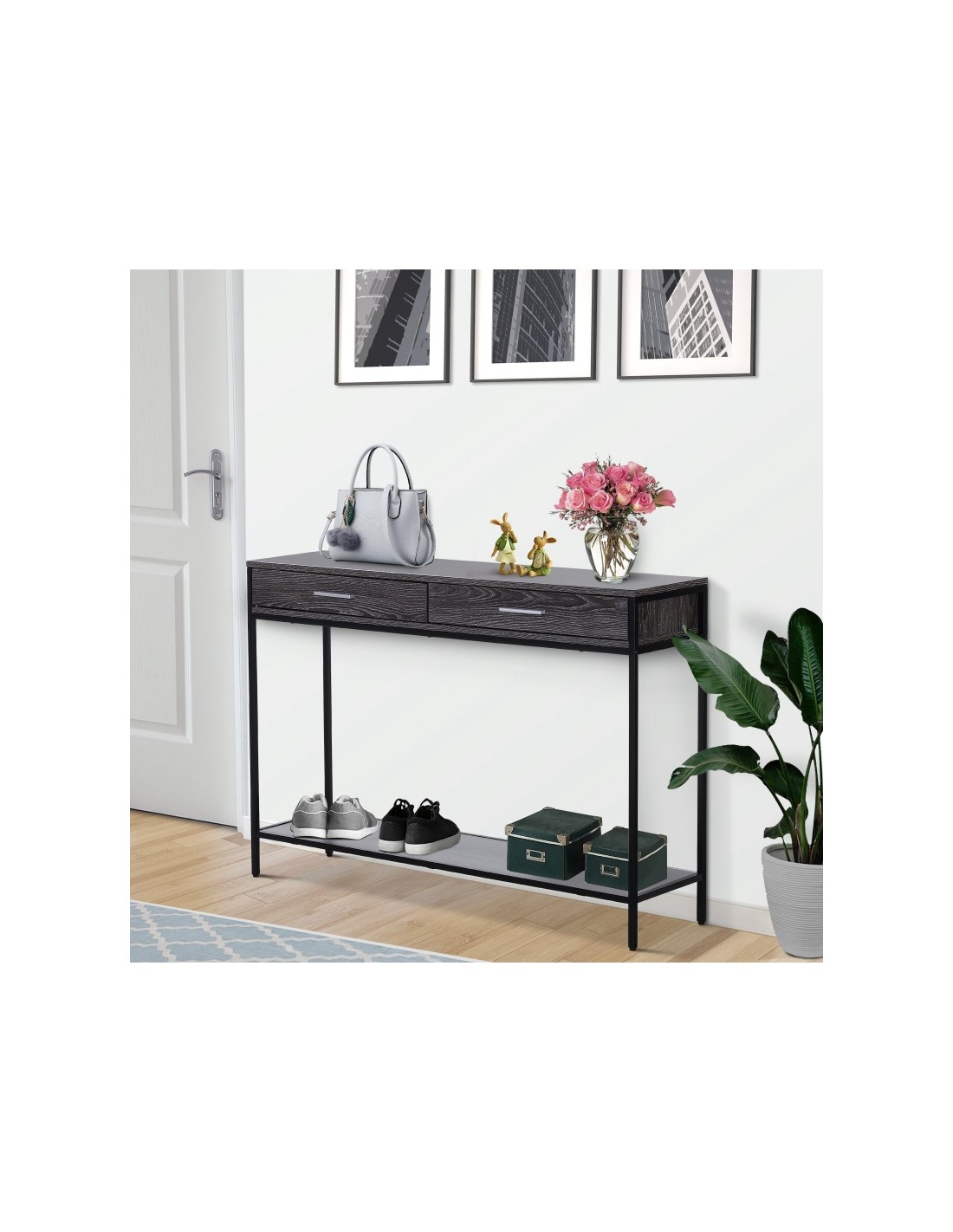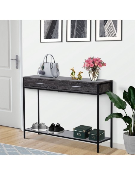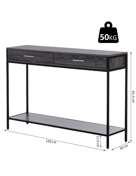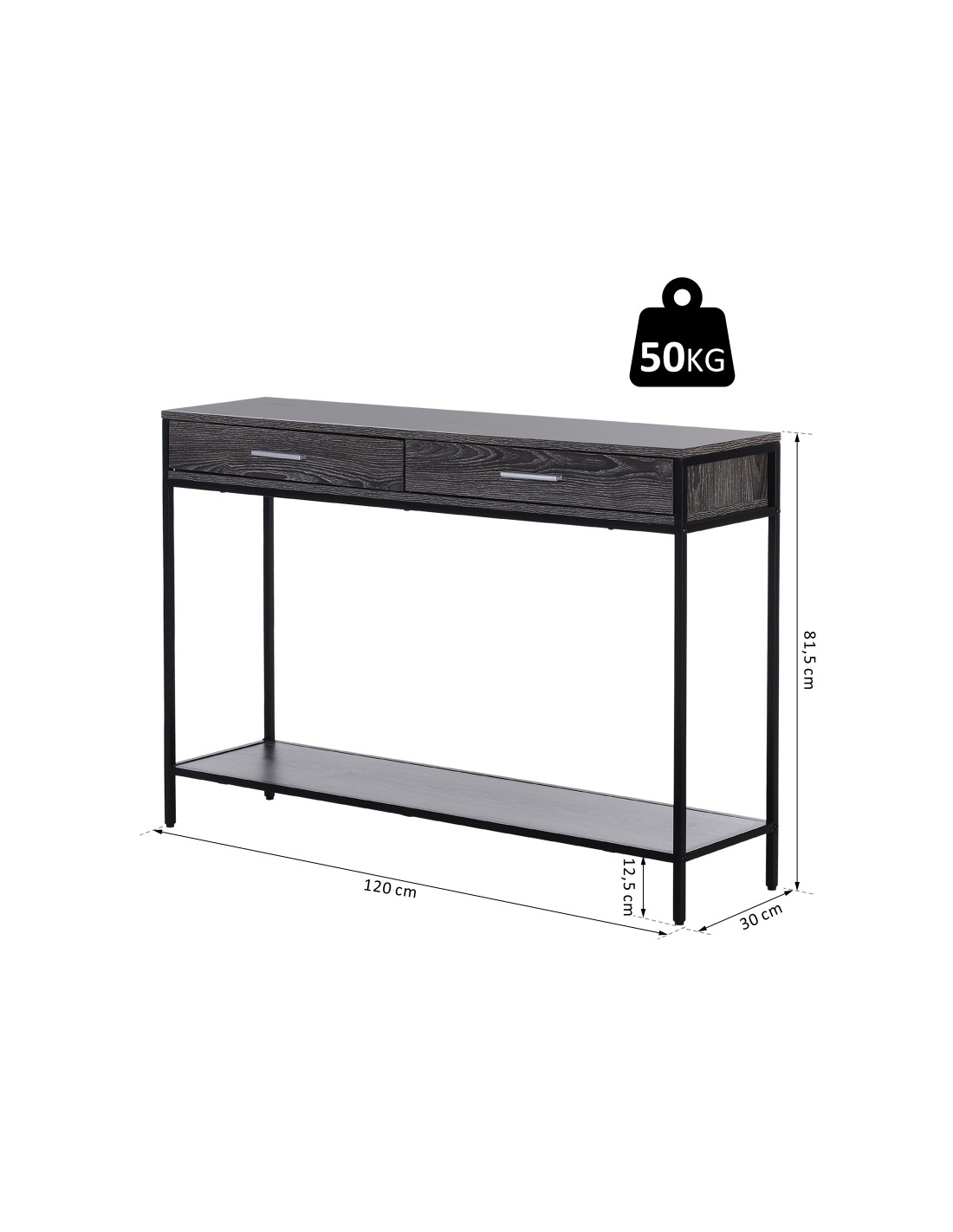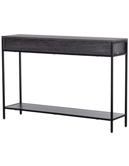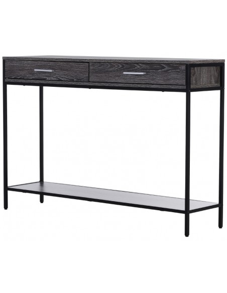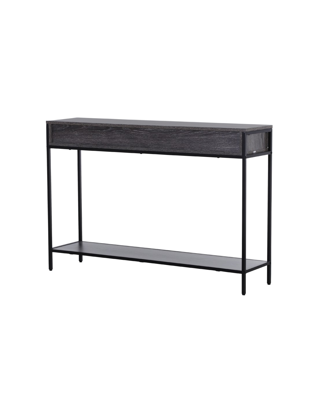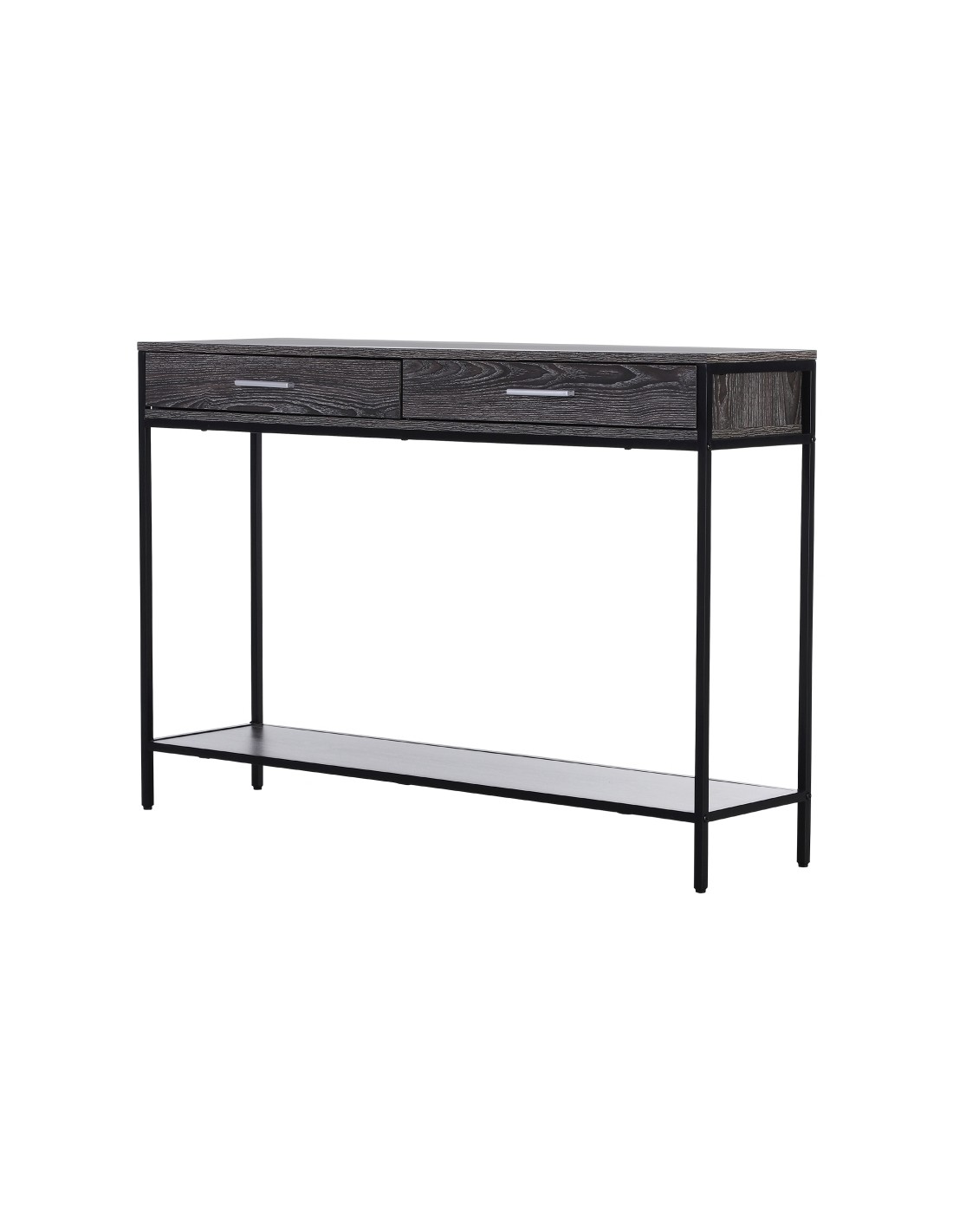 Konsolbord udført i et design af stål og møbelplade. Konsolbordet måler 120 x 30 cm i bredde og dybde og 81,5 cm i højden. Konsolbordet indeholder 1 åbent hylderum samt 2 skuffer.