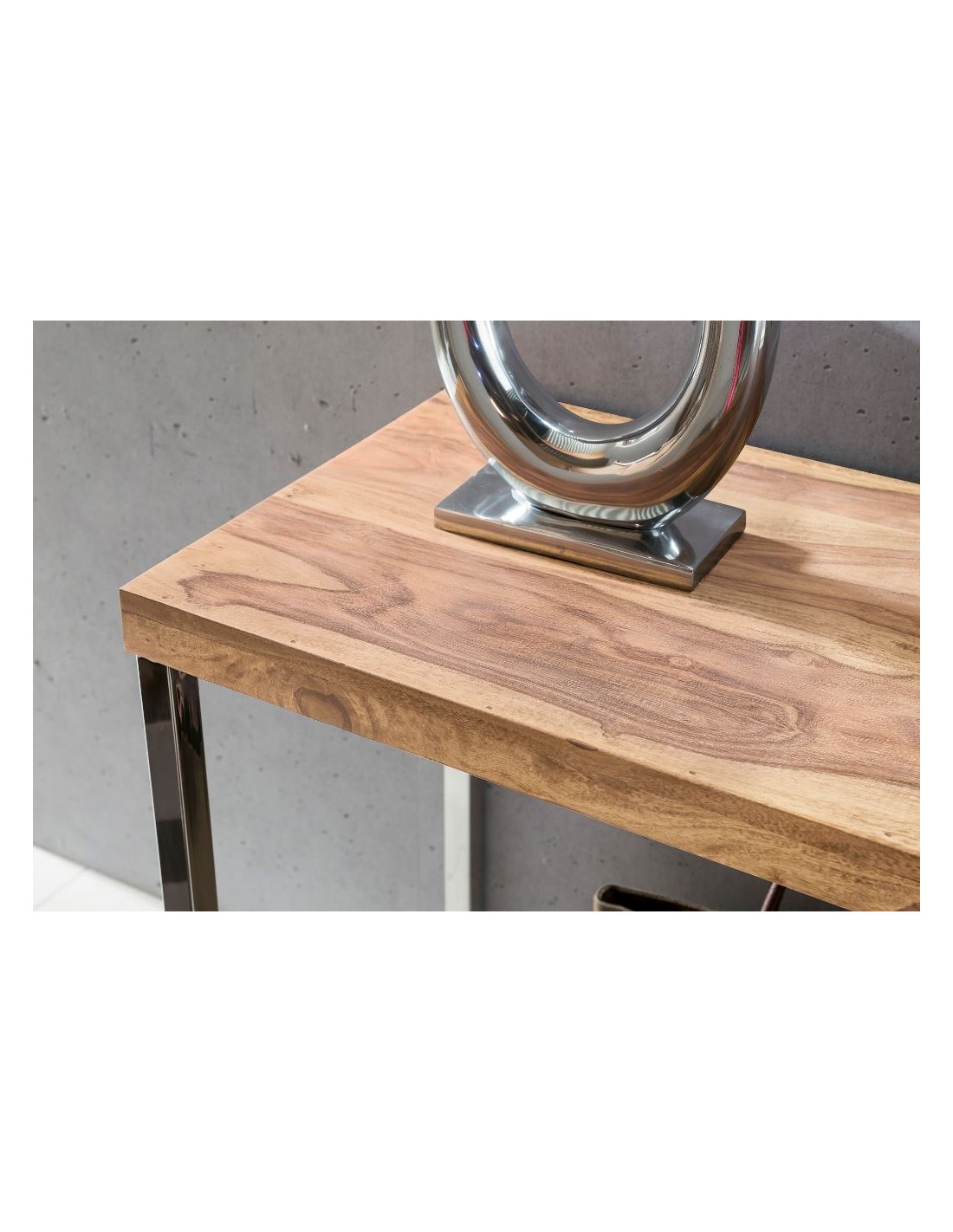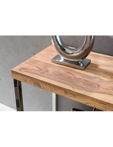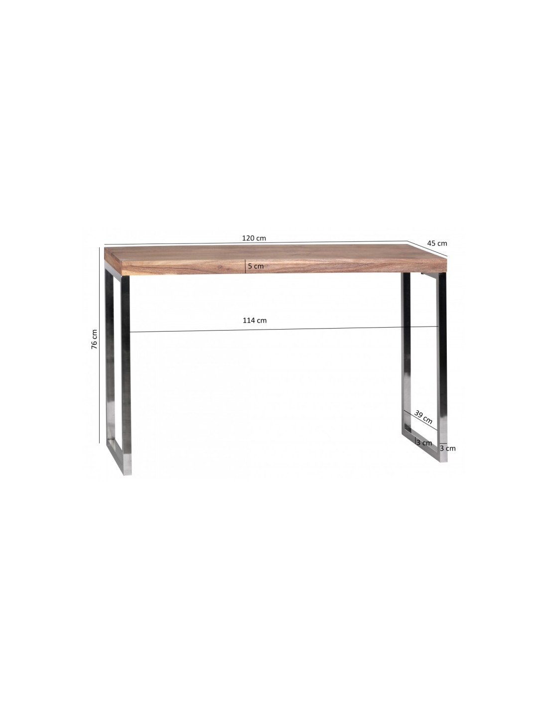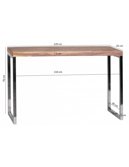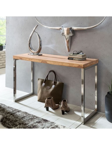 Konsolbord fremstillet i et design af kromlakeret metal og akacietræ. Bordet måler 76 cm i højden og 120 x 46 cm i bredde og dybde.