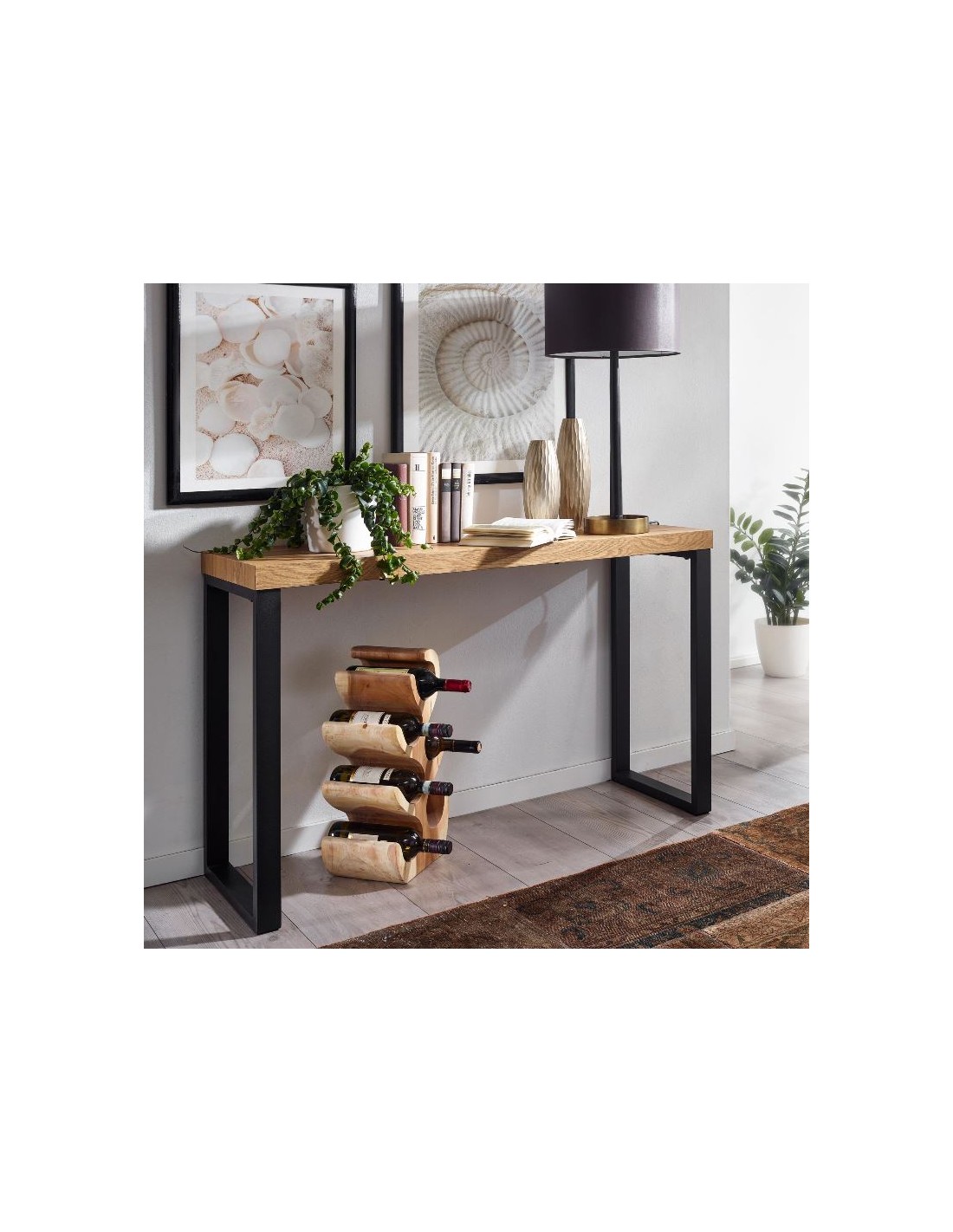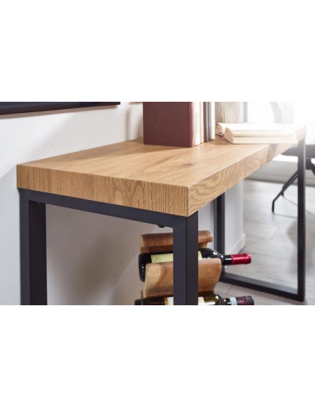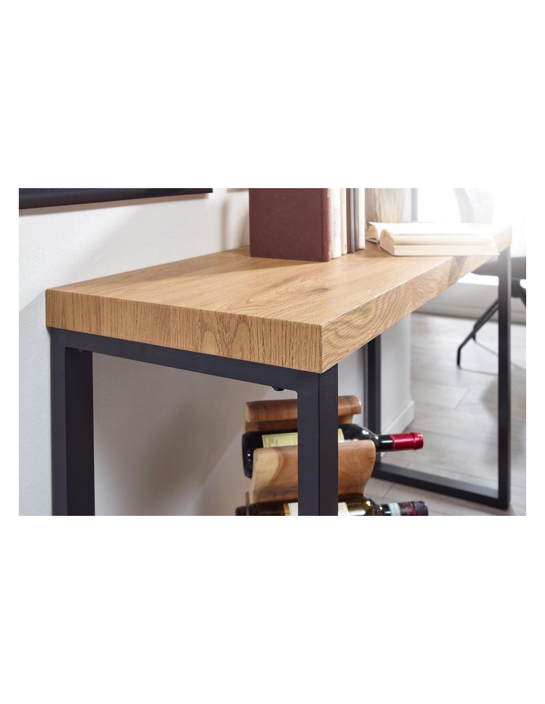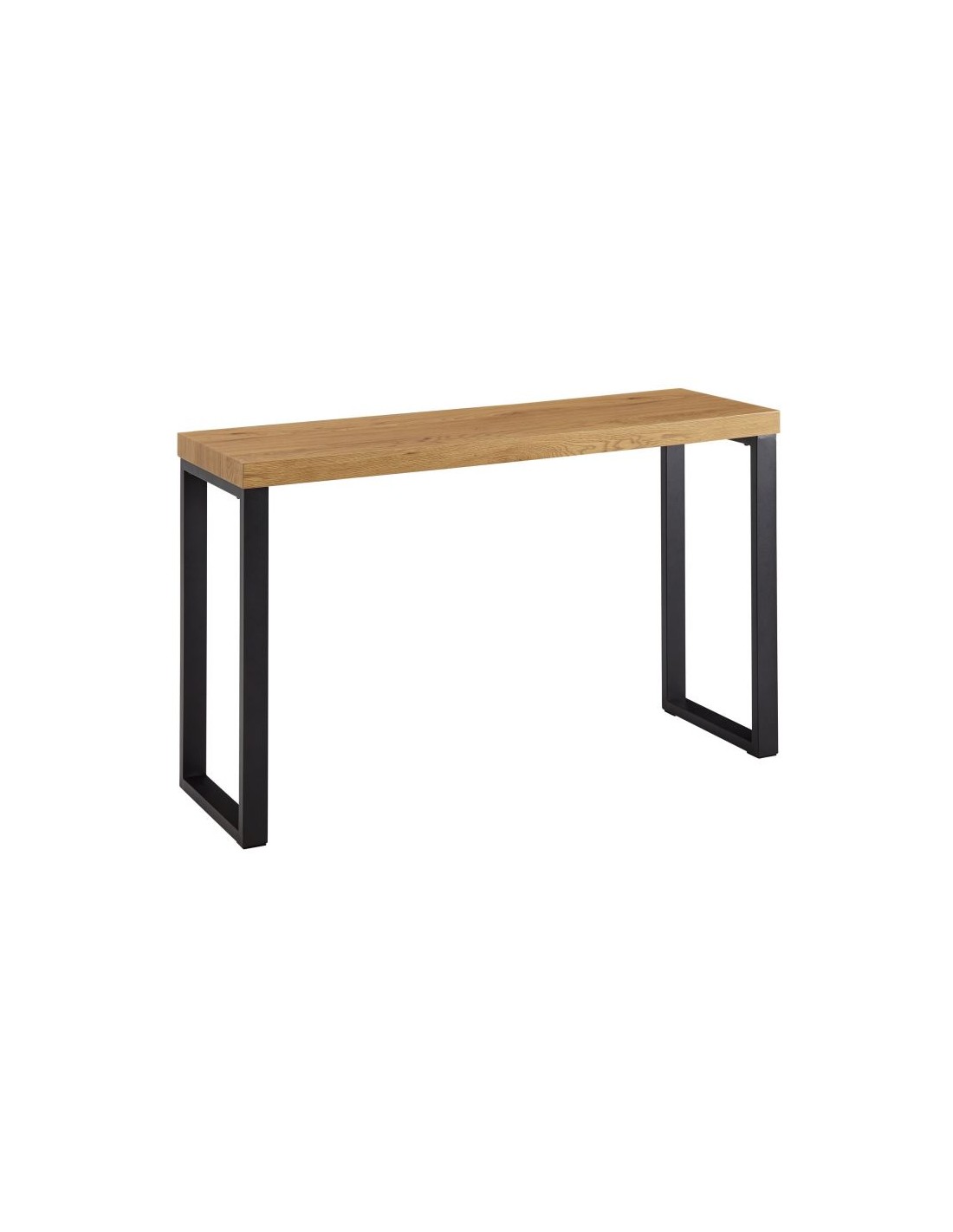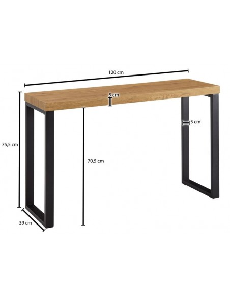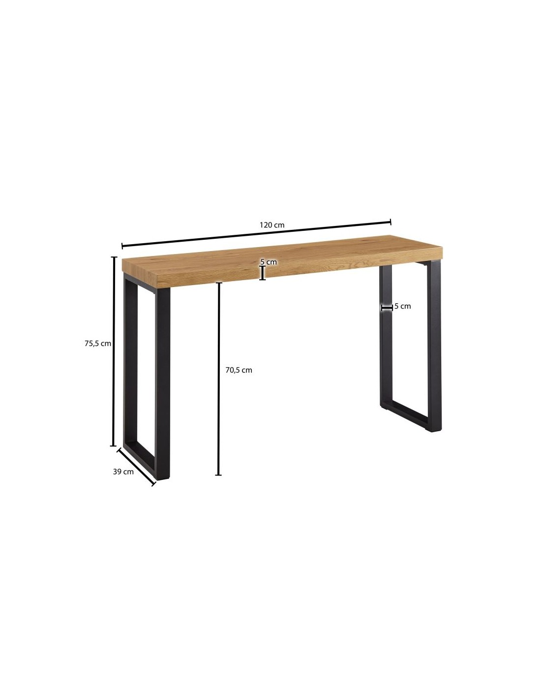 Konsolbord fremstillet i et design af sortlakeret metal og egetræsfarvet mdf. Bordet måler 75,5 cm i højden og 120 x 39 cm i bredde og dybde.