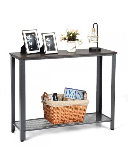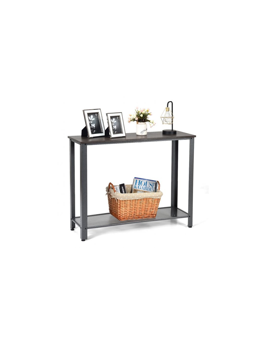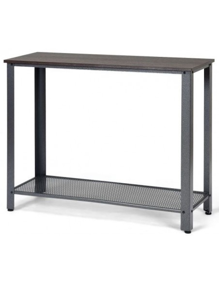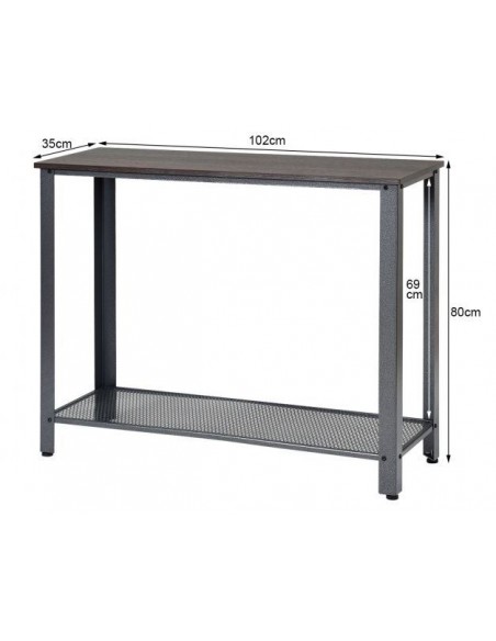 Konsolbord udført i et design af grålakeret metal og brun møbelplade. Konsolbordet måler 80 cm i højden og 102 x 35 cm i bredde og dybde.