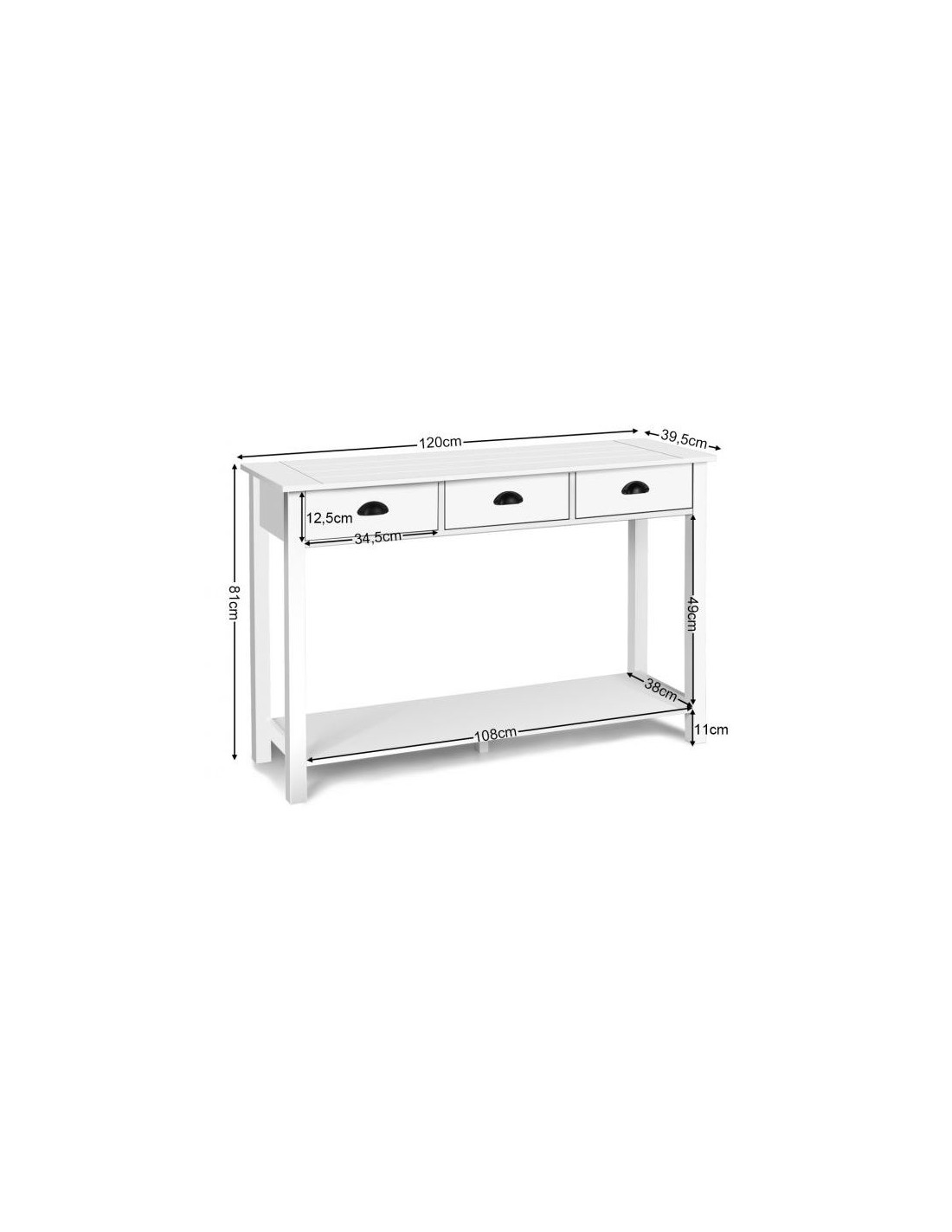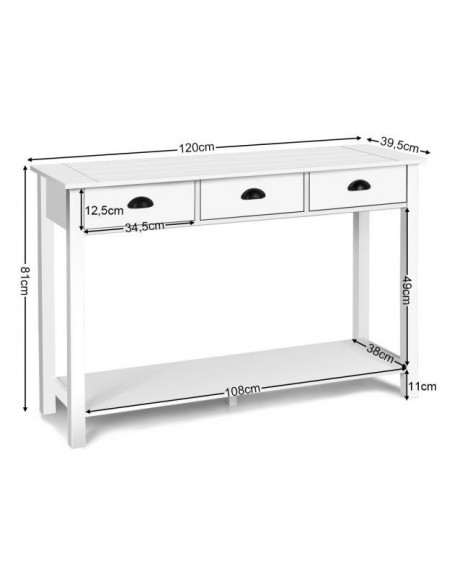 Konsolbord udført i et design af hvidlakeret mdf. Konsolbordet måler 81 cm i højden og 120 x 39,5 cm i bredde og dybde.
