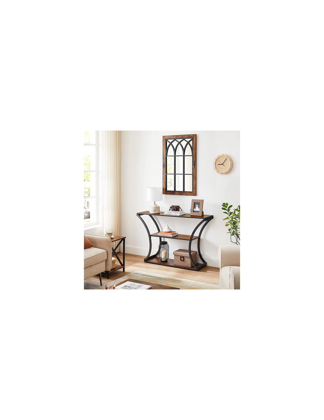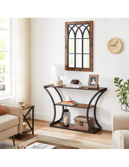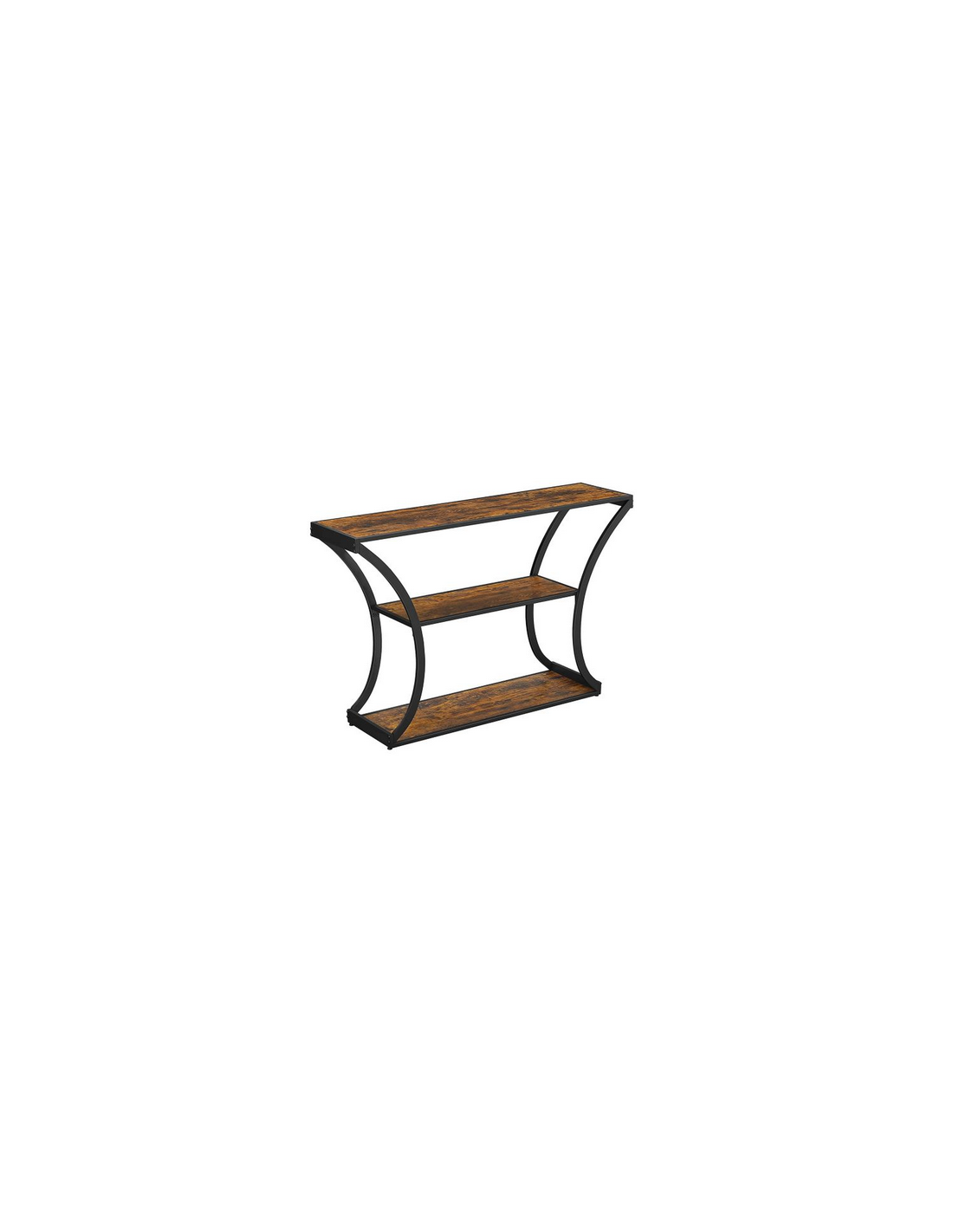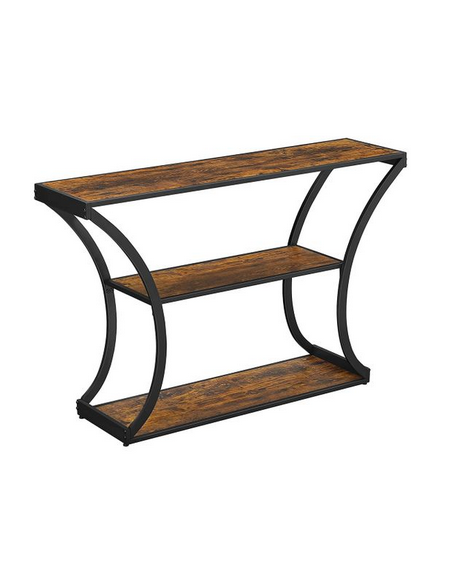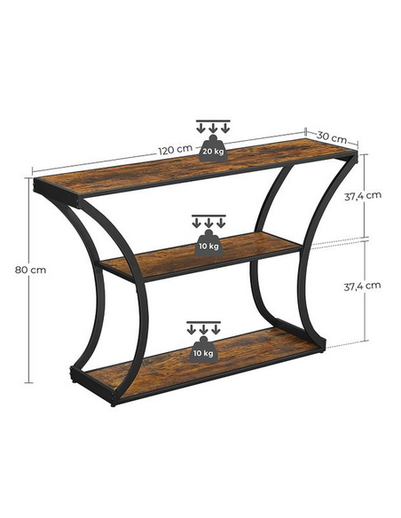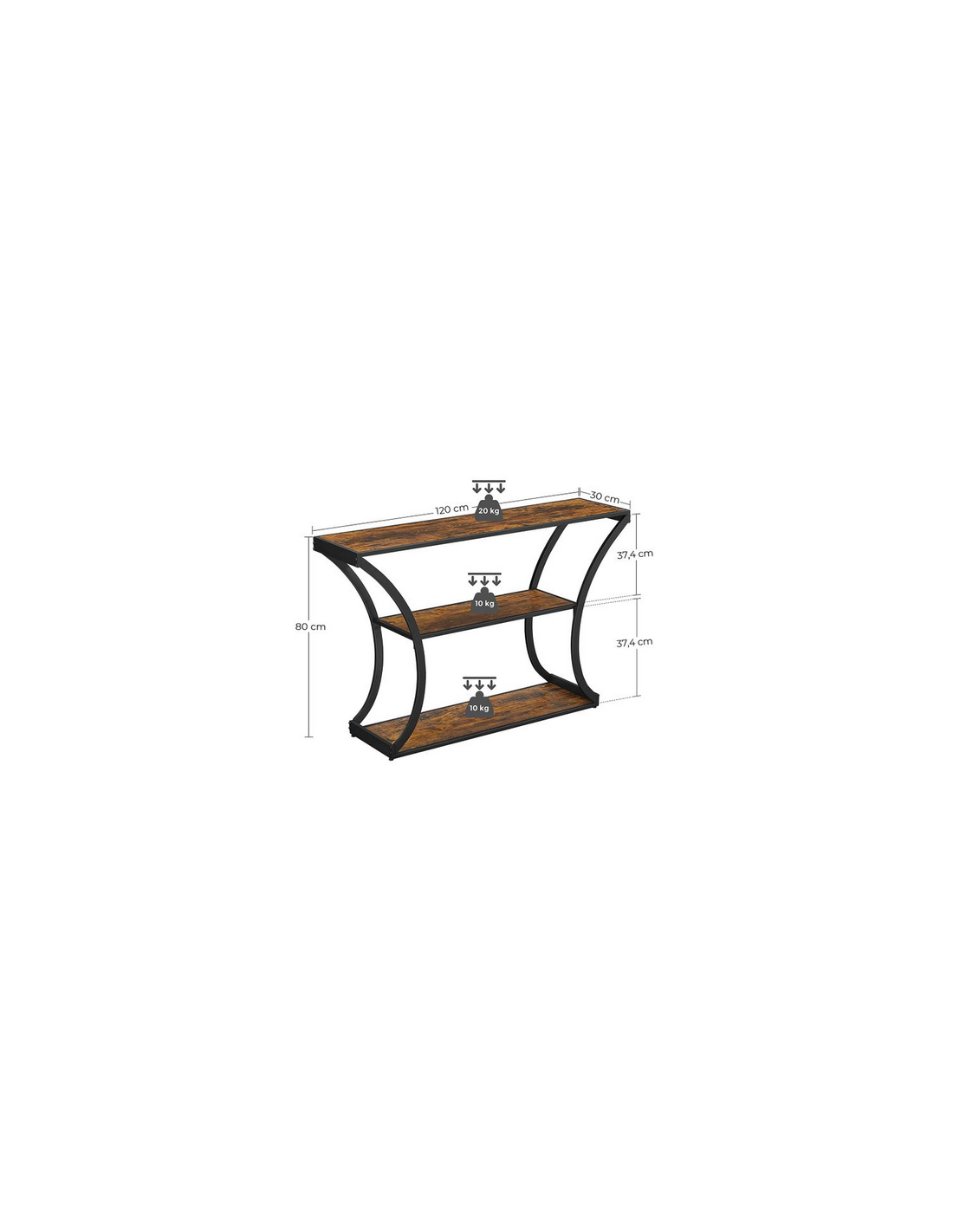 Konsolbord udført i et design af sortlakeret metal og brun møbelplade. Konsolbordet måler 80 cm i højden og 120 x 30 cm i bredde og dybde.