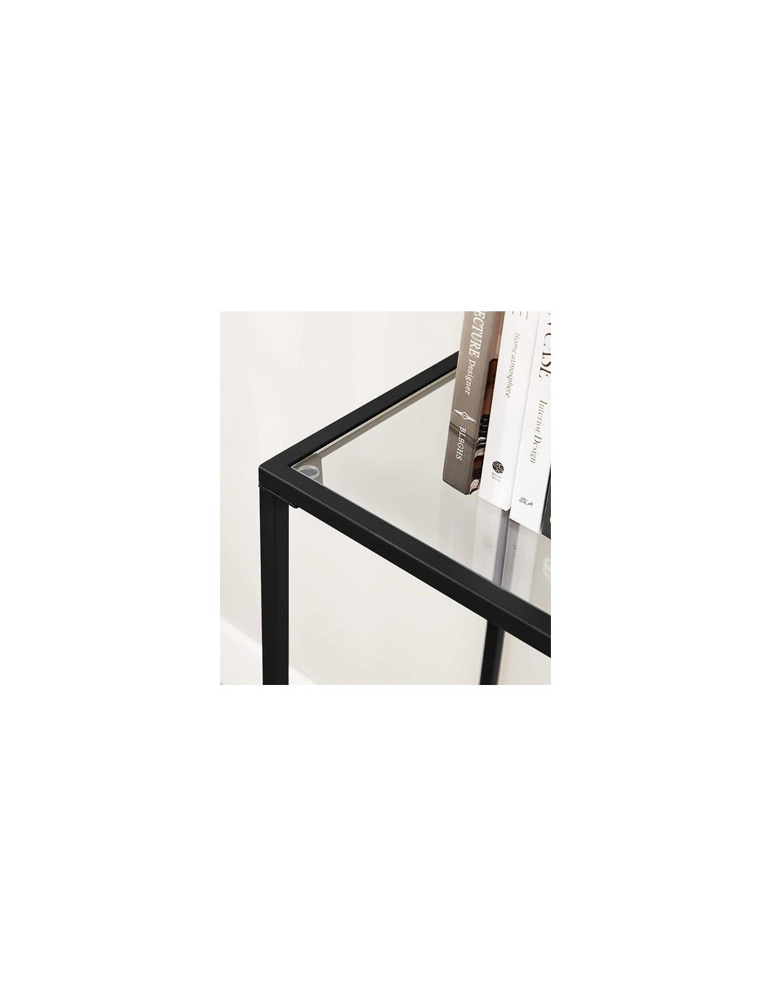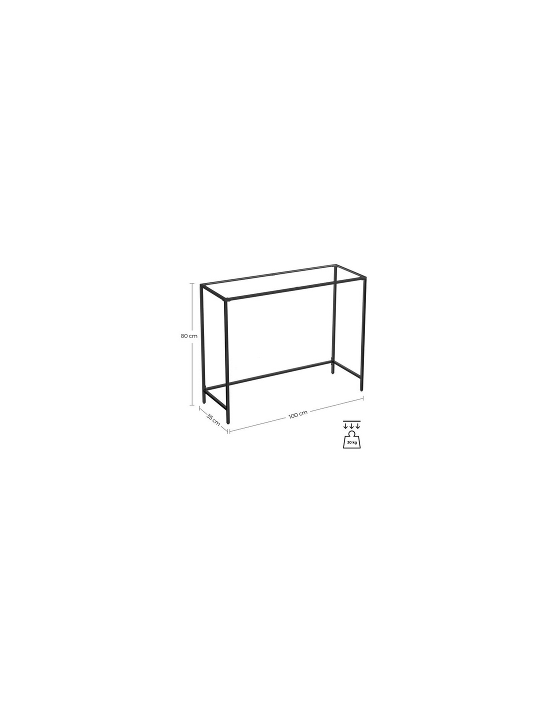 Konsolbord udført i et design af sortlakeret metal og klart glas. Konsolbordet måler 80 cm i højden og 100 x 35 cm i bredde og dybde.