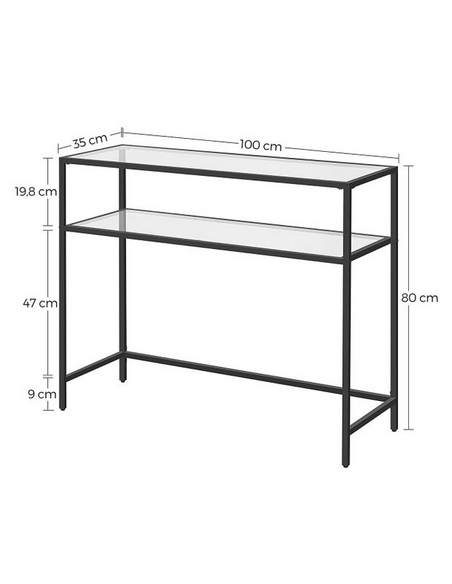 Konsolbord udført i et design af sortlakeret metal og klart glas. Konsolbordet måler 80 cm i højden og 100 x 35 cm i bredde og dybde.
