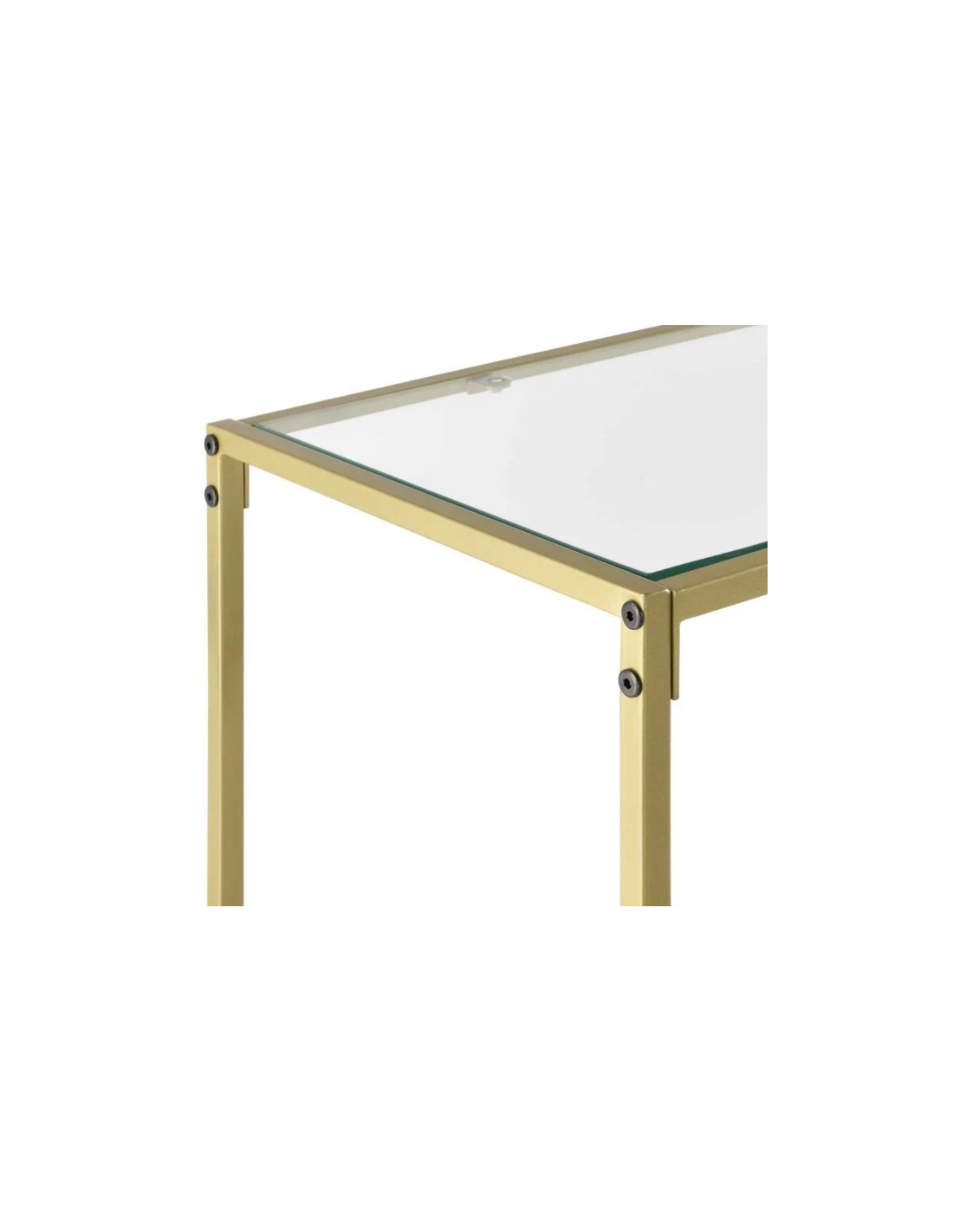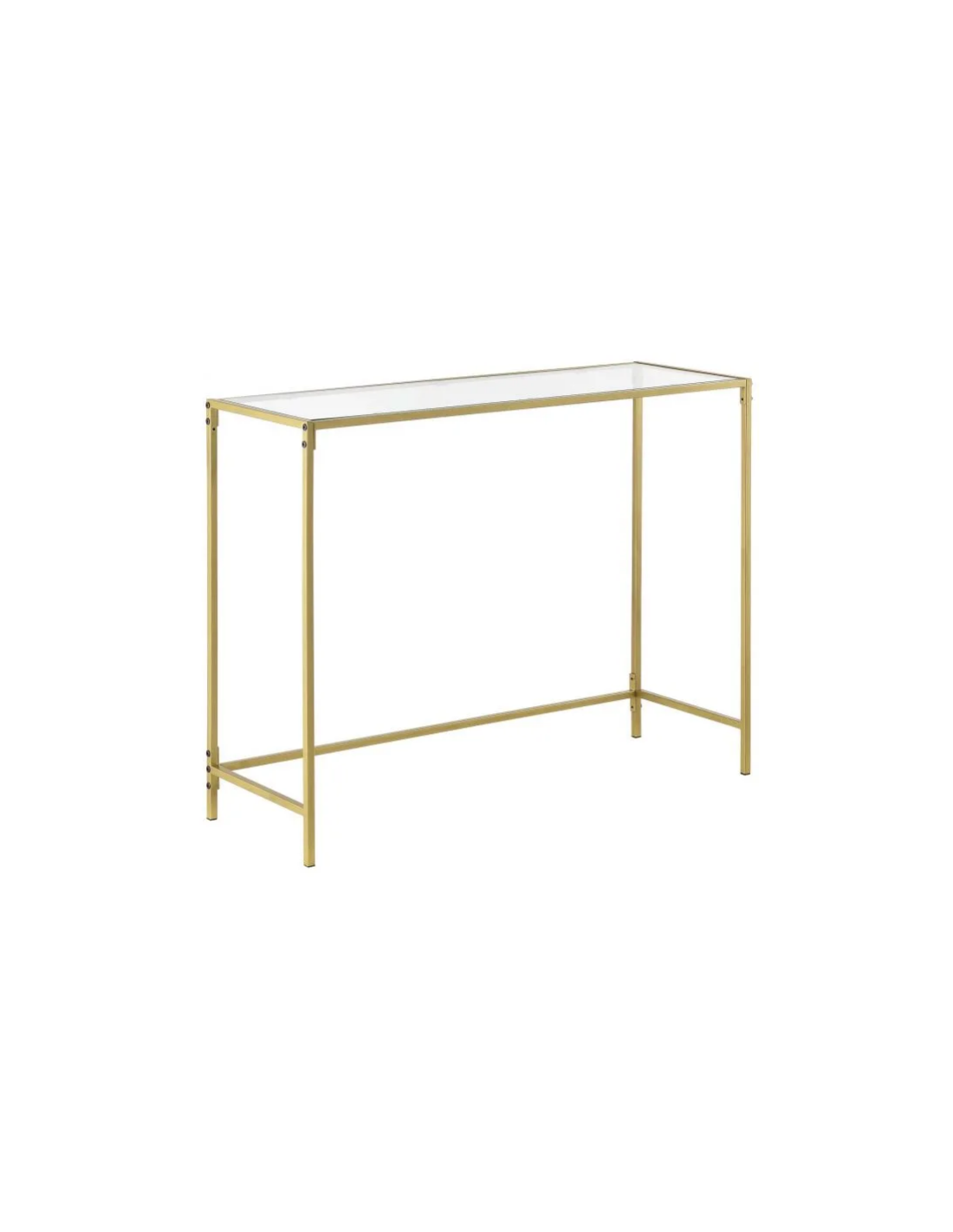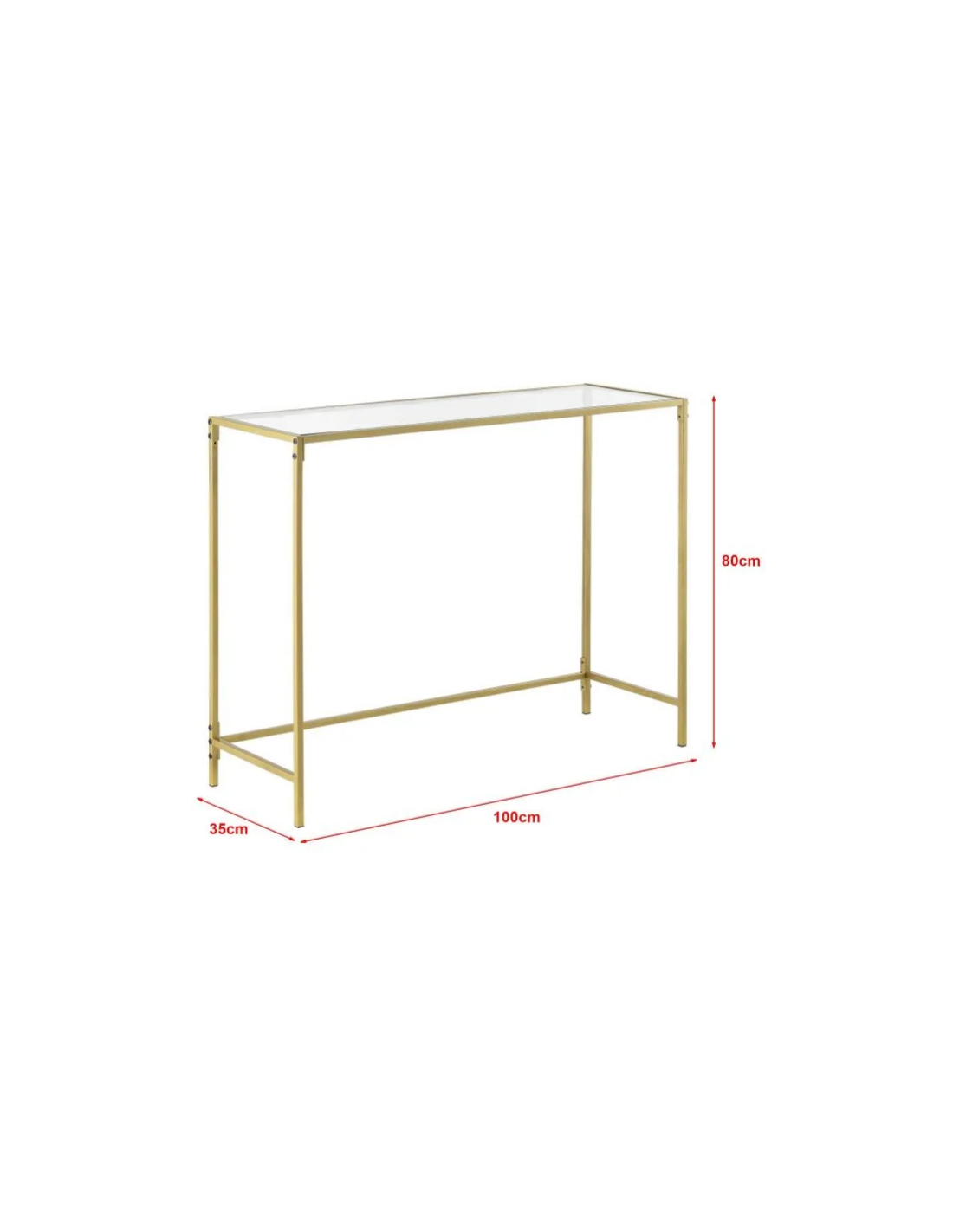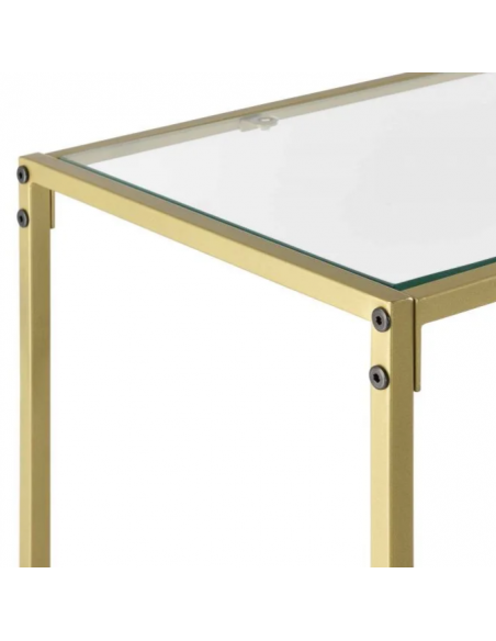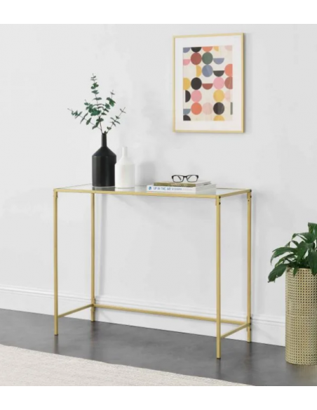 Konsolbord udført i et design af guldfarvet metal og klart glas. Konsolbordet måler 80 cm i højden og 100 x 35 cm i bredde og dybde.