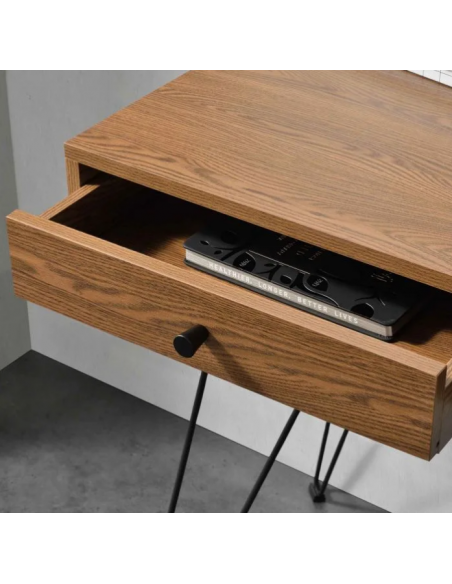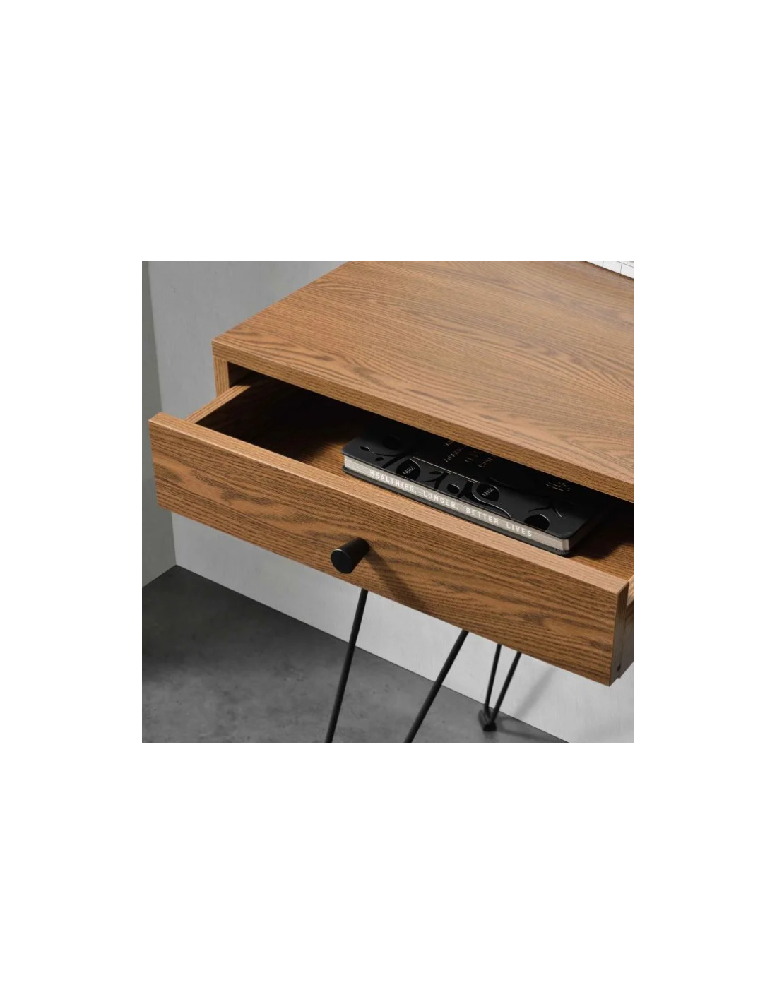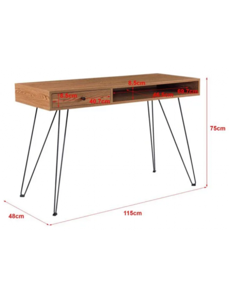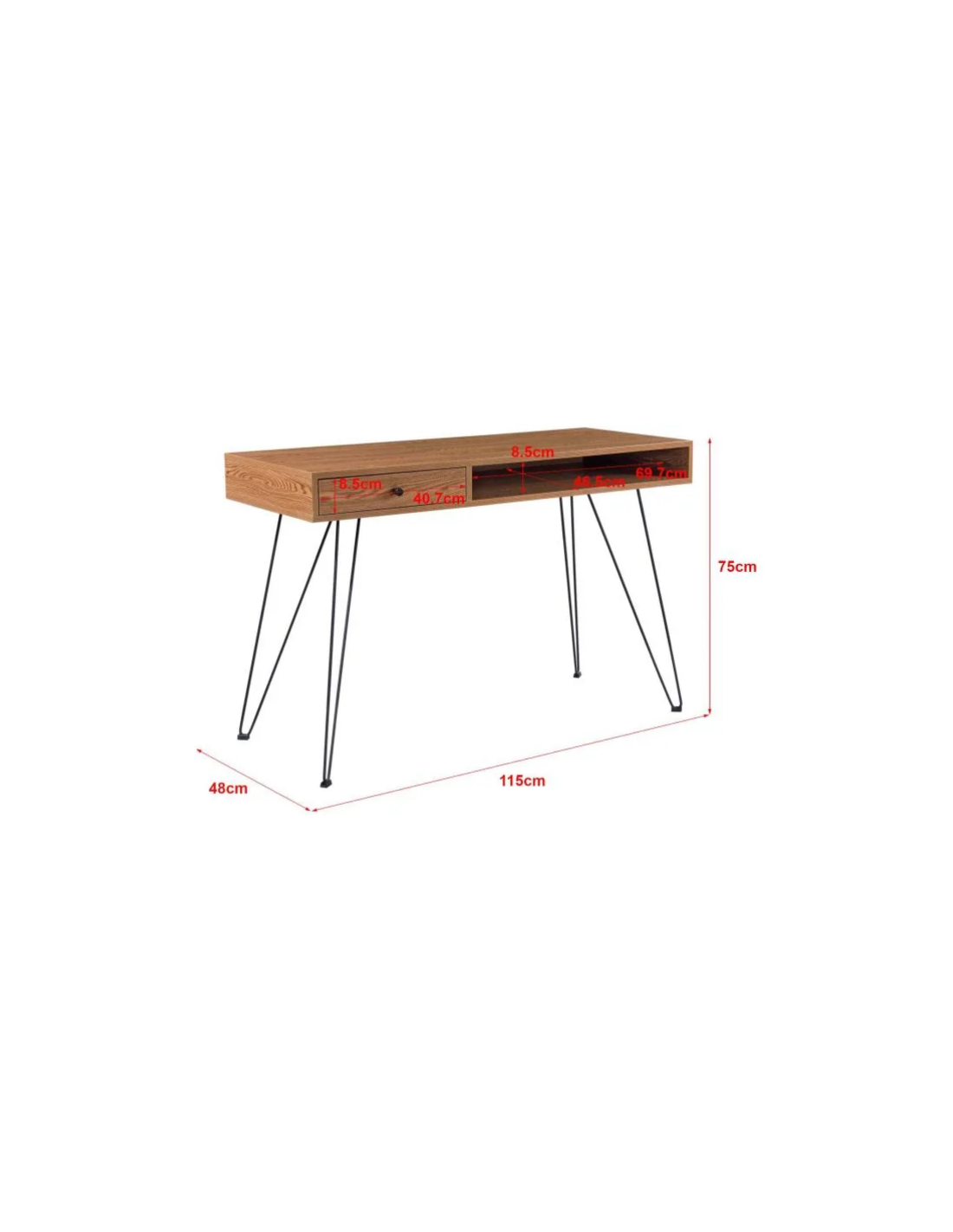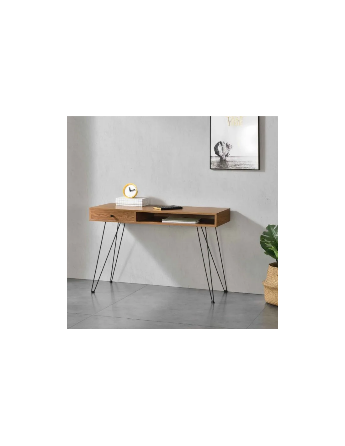Konsolbord udført i et design af sortlakeret metal og nøddefarvet møbelplade. Konsolbordet måler 75 cm i højden og 115 x 48 cm i bredde og dybde.