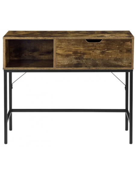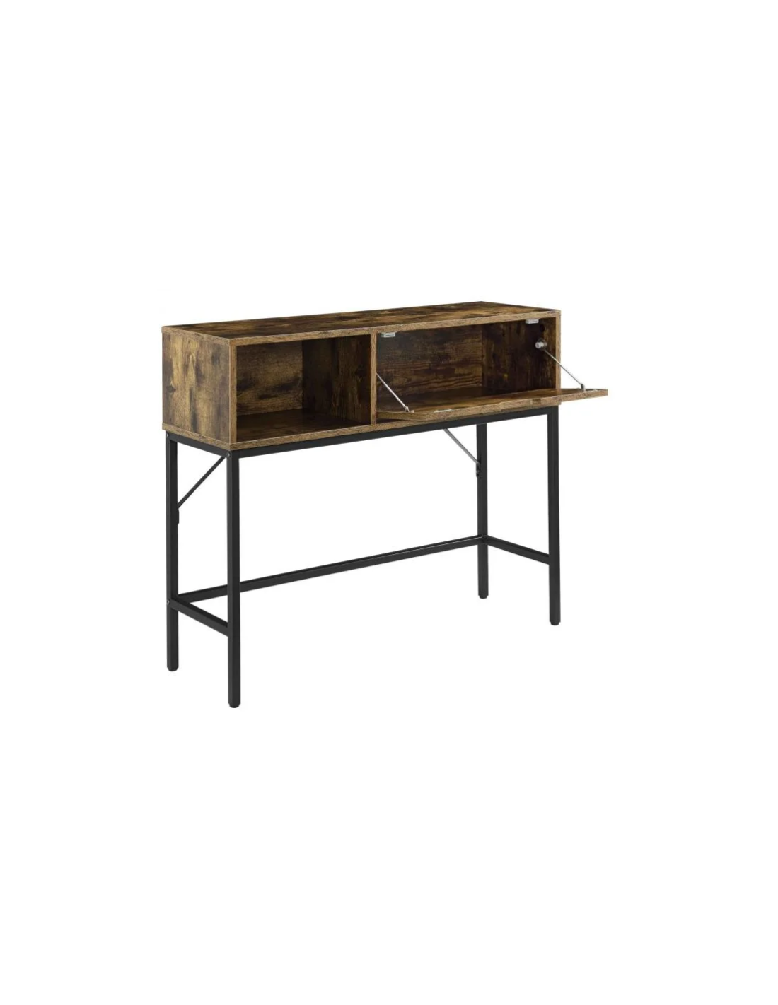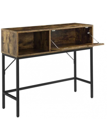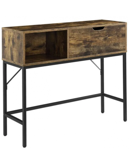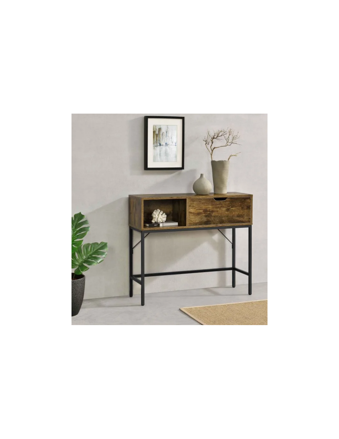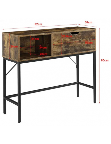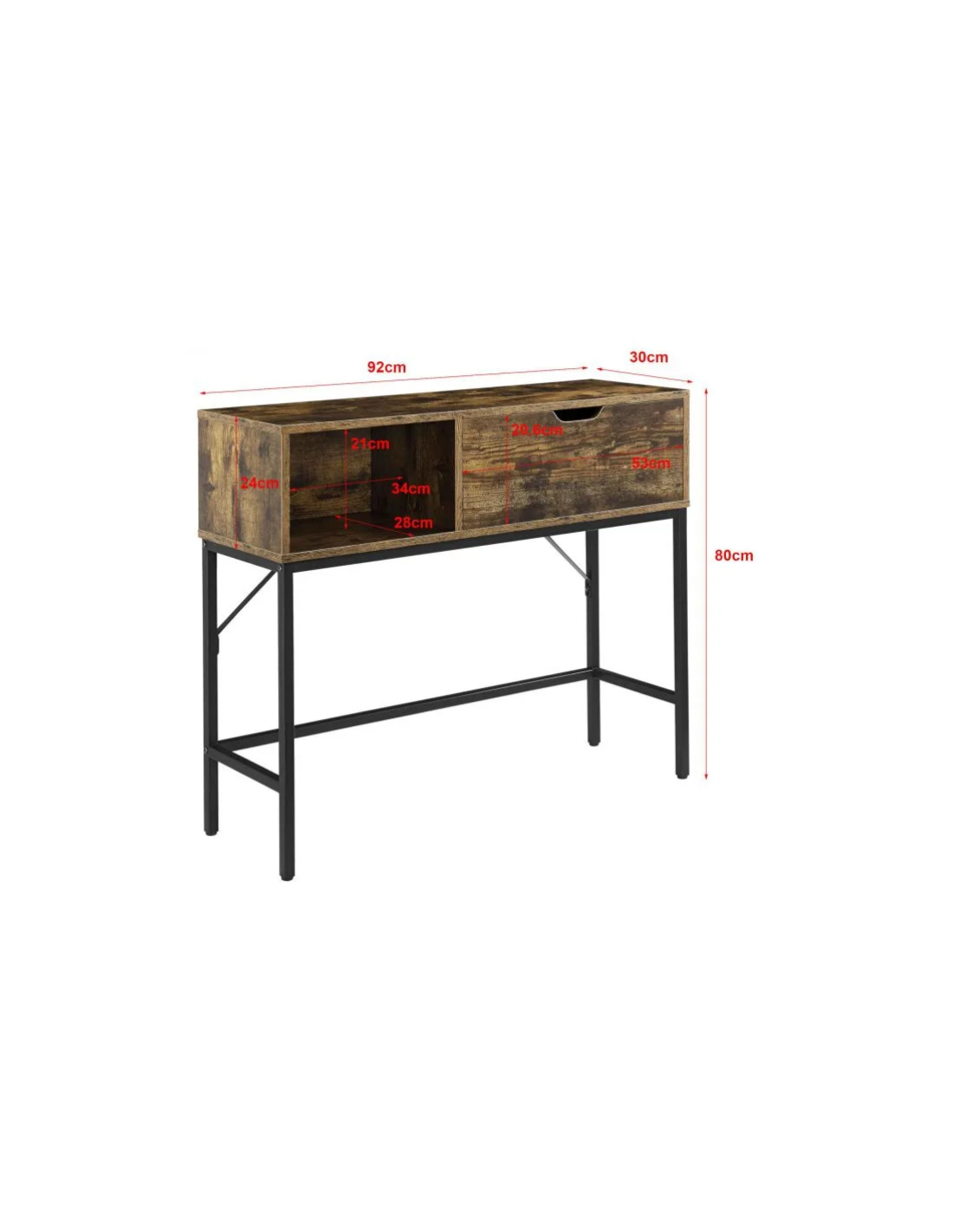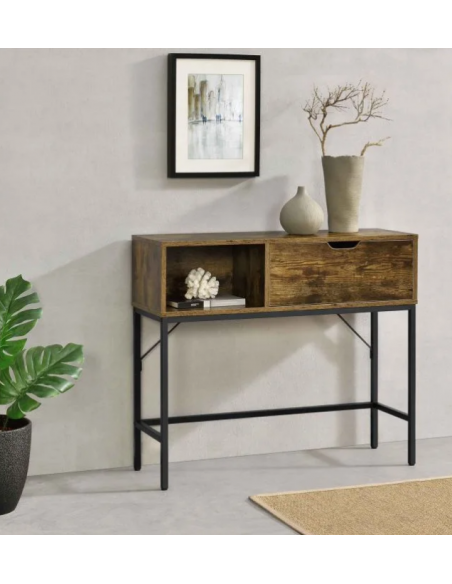Konsolbord udført i et design af sortlakeret metal og brun møbelplade. Konsolbordet måler 80 cm i højden og 92 x 30 cm i bredde og dybde.