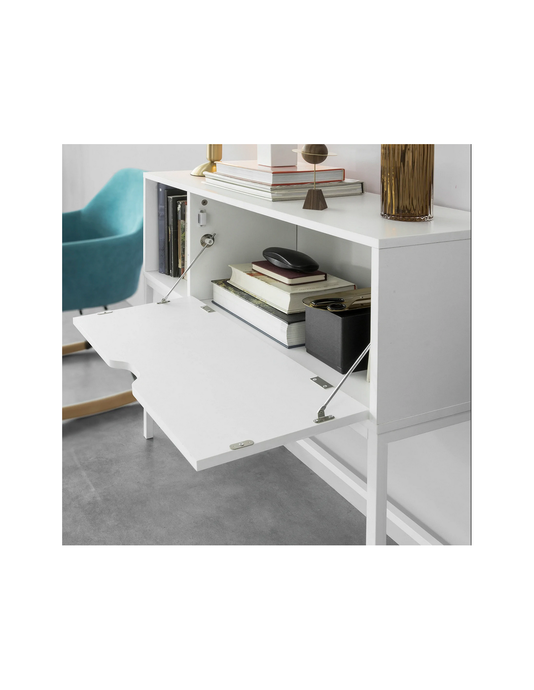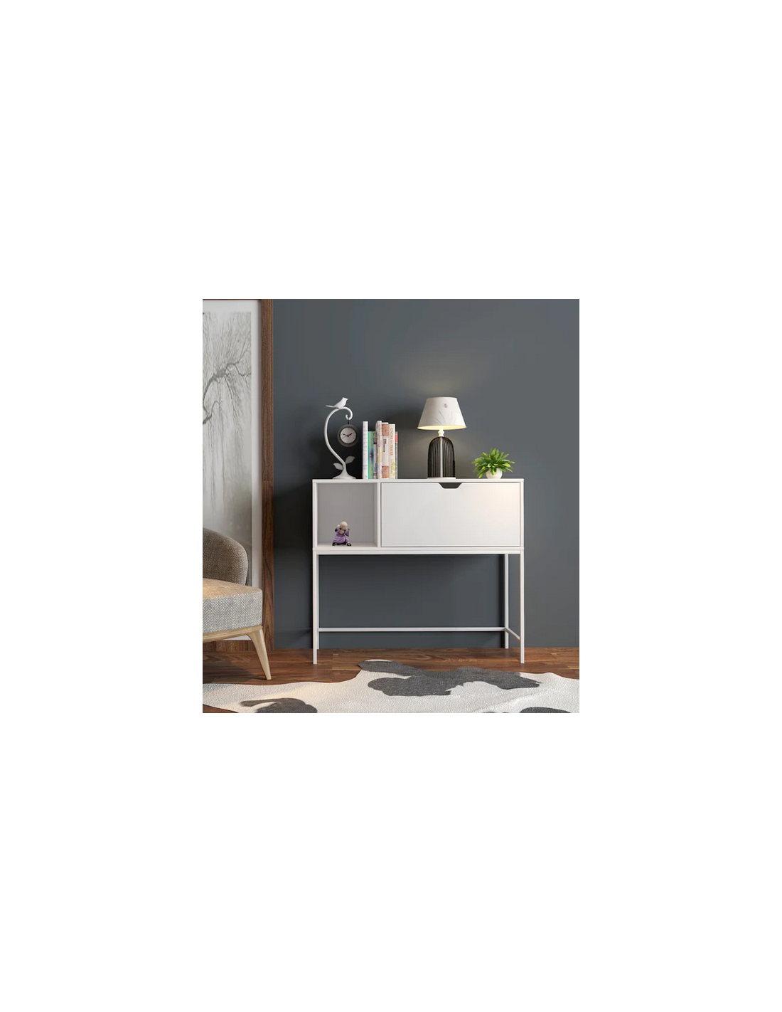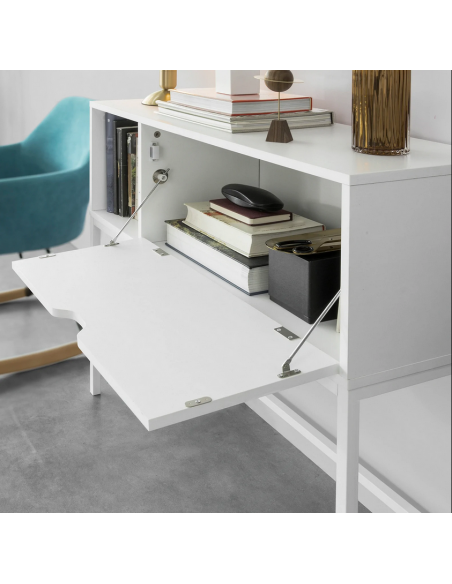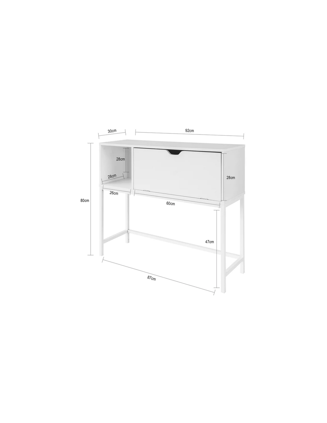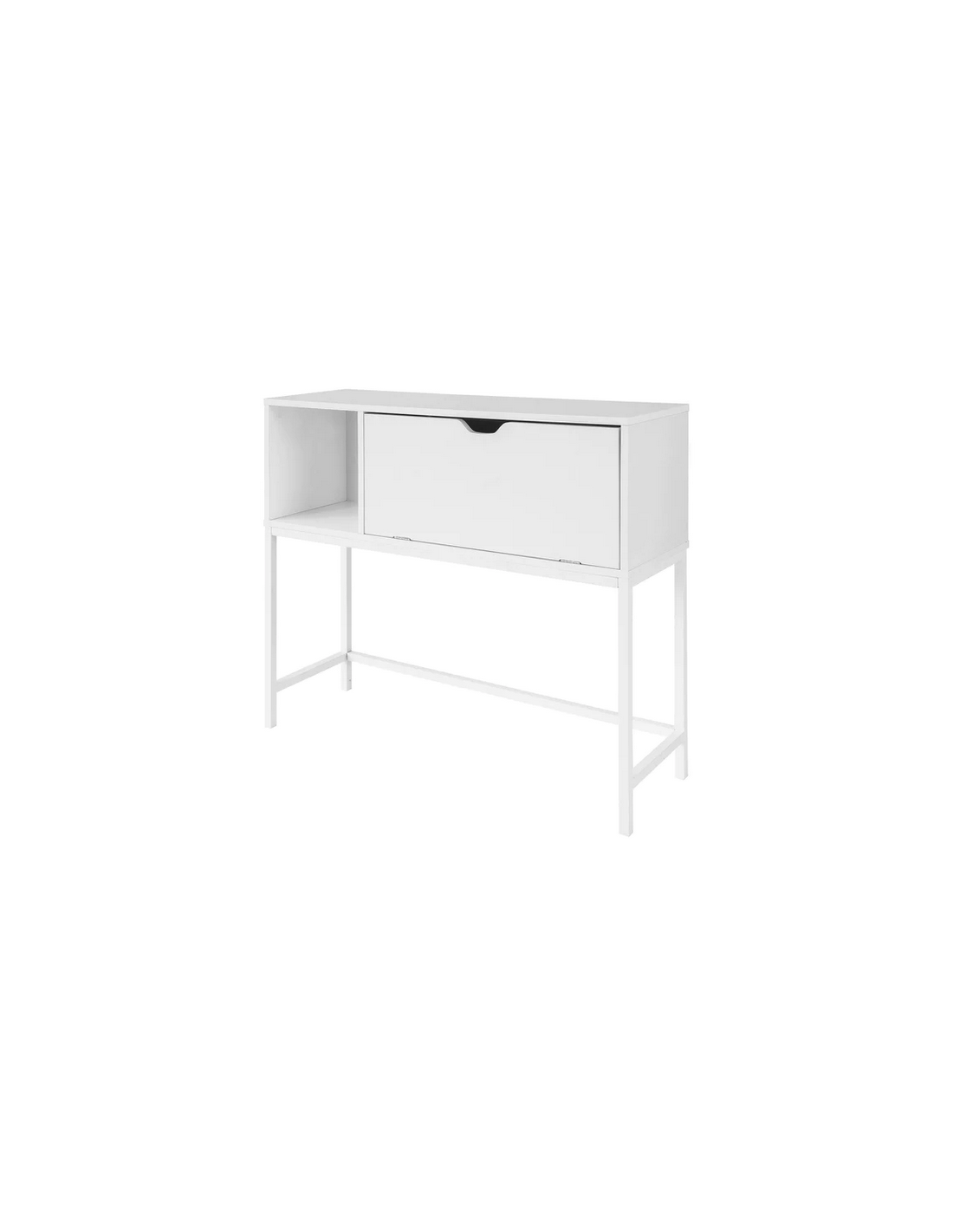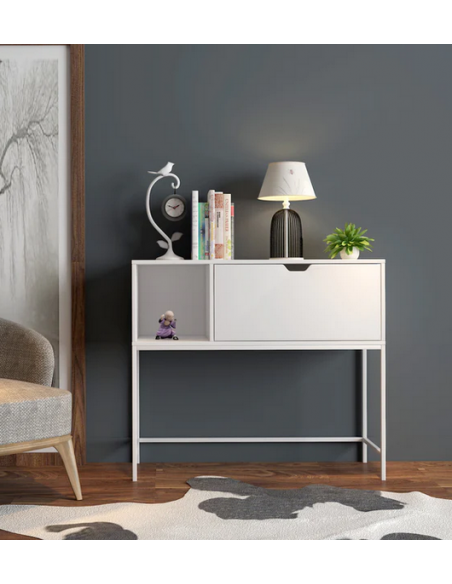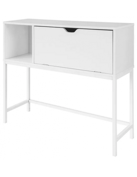 Konsolbord udført i et design af hvidlakeret metal og hvid møbelplade. Konsolbordet måler 80 cm i højden og 92 x 30 cm i bredde og dybde.