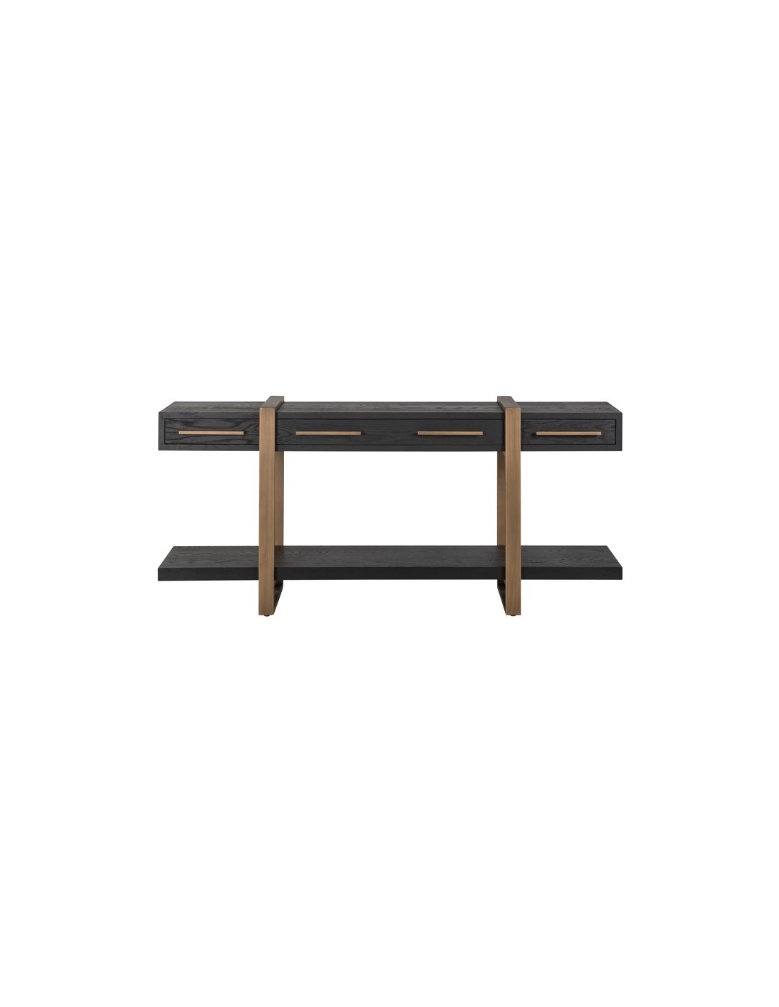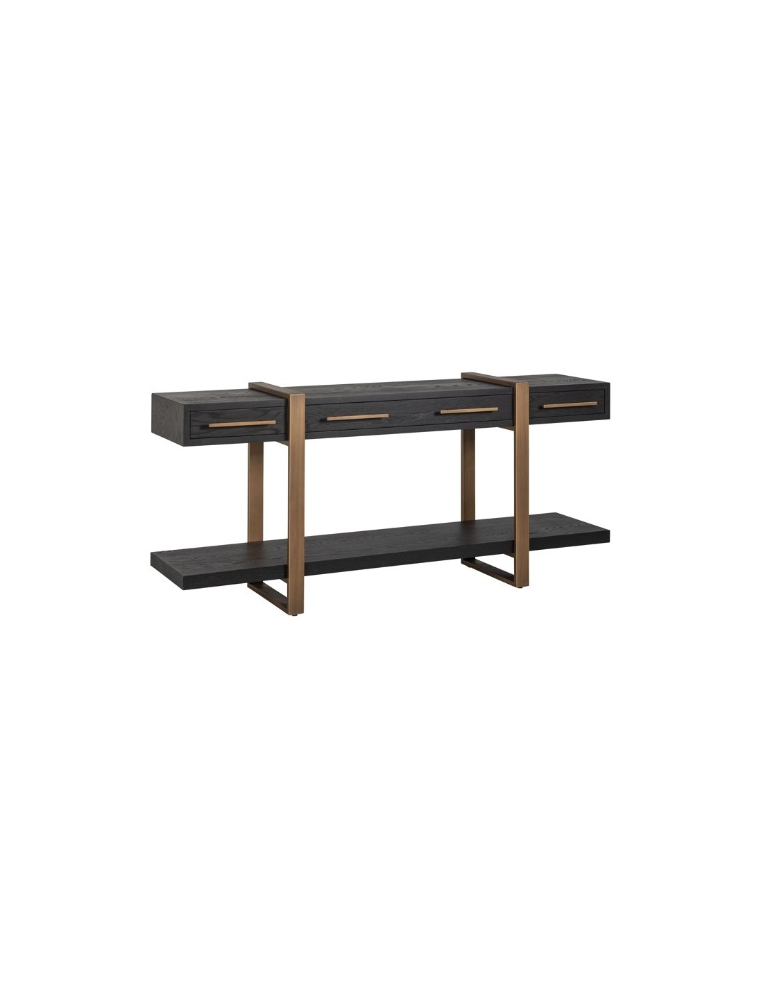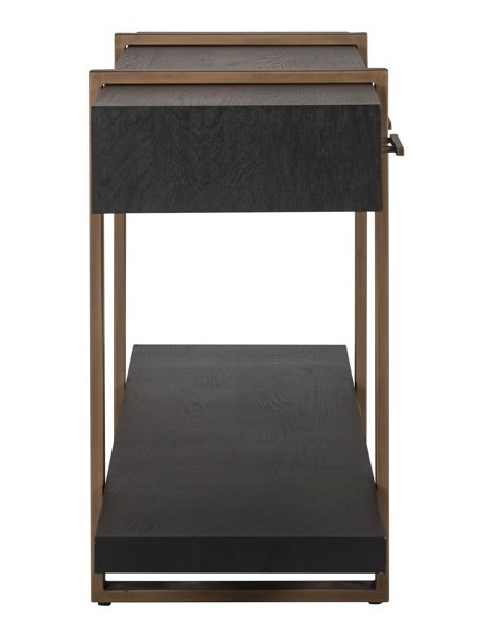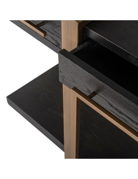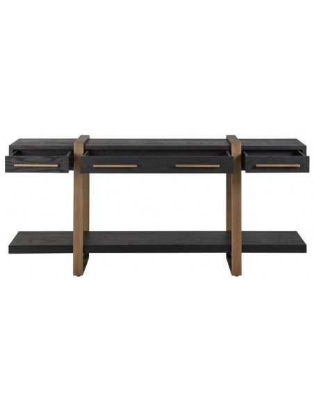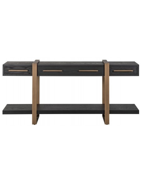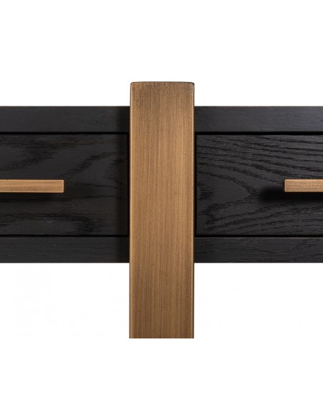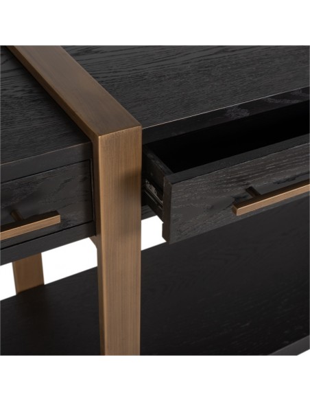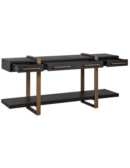Konsolbord fra hollandske Richmond Interiors, udført i et design af børstet bronzelakeret stål og sort egetræsfinér. Konsolbordet måler 80 cm i højden og 180 x 45 cm i bredde og dybde. Konsolbordet har 3 skuffer.