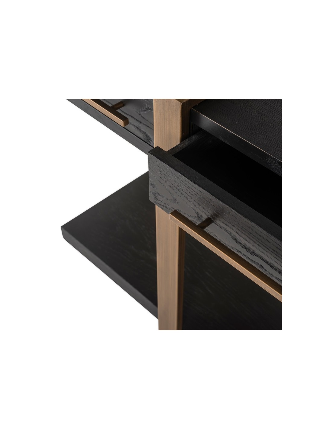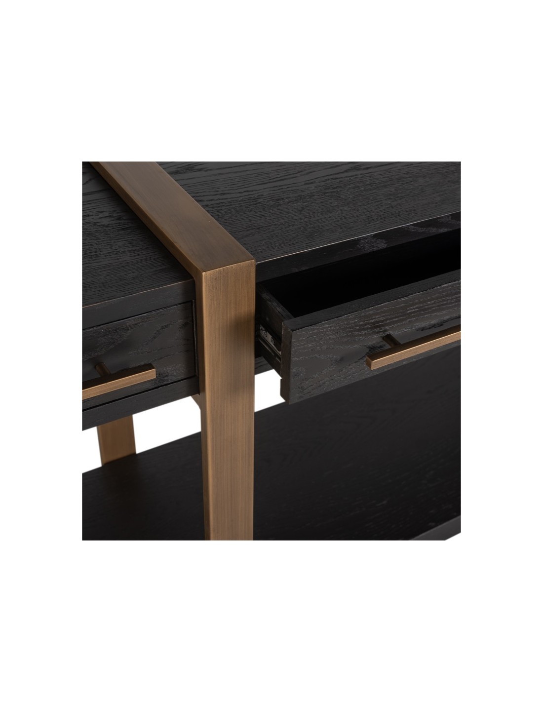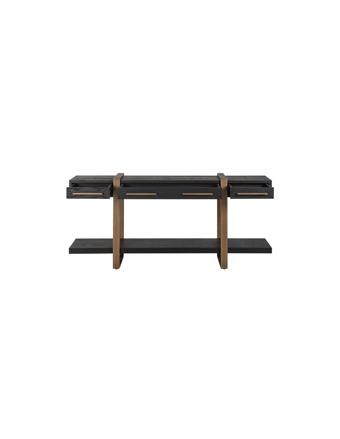 Konsolbord fra hollandske Richmond Interiors, udført i et design af børstet bronzelakeret stål og sort egetræsfinér. Konsolbordet måler 80 cm i højden og 180 x 45 cm i bredde og dybde. Konsolbordet har 3 skuffer.