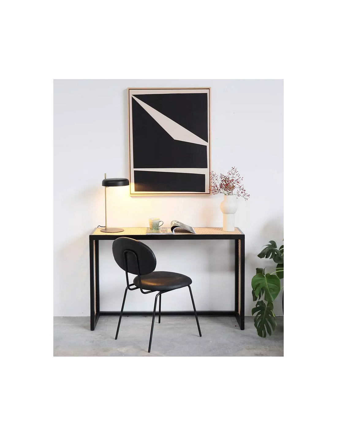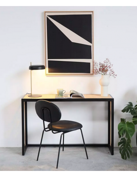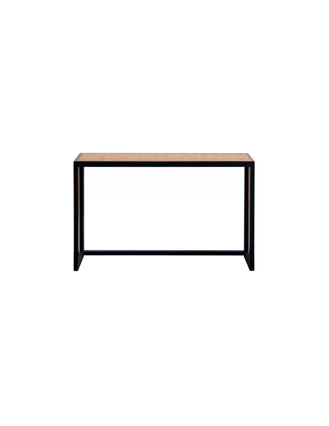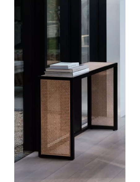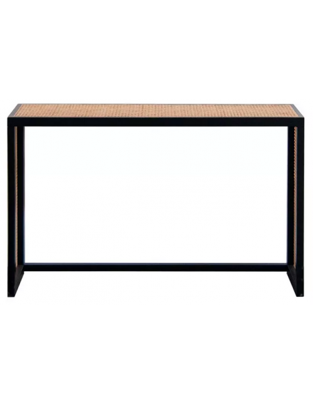 Konsolbord udført i et moderne design af sortlakeret finér og naturfarvet rattan. Konsolbordet måler 76 cm i højden og 122 x 36 cm i bredde og dybde.