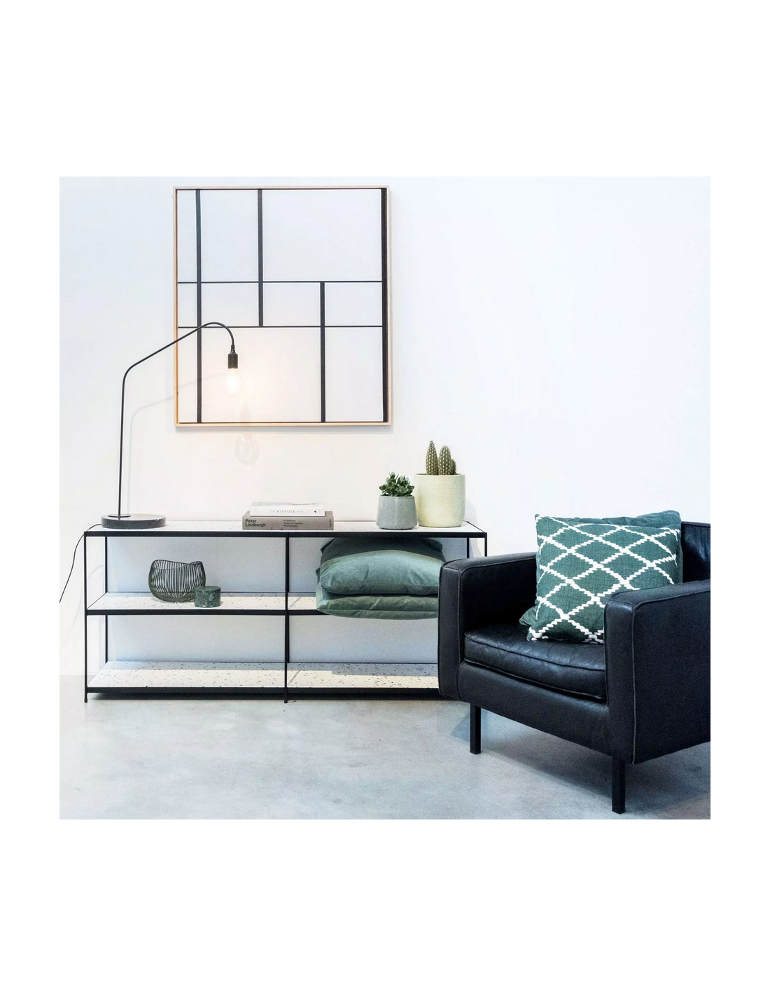 Konsolbord udført i et moderne design af mat sortlakeret metal og hvid terrazzo. Konsolbordet måler 65 cm i højden og 150 x 40 cm i bredde og dybde.