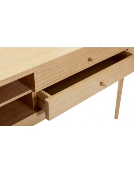 Hübsch Collect konsolbord udført i et design af egetræ og egetræsfinér. Konsolbordet måler 94 cm i højden og 154 x 37 cm i bredde og dybde. Konsolbordet indeholder 2 åbne hylderum, 2 skuffer samt 1 skab.