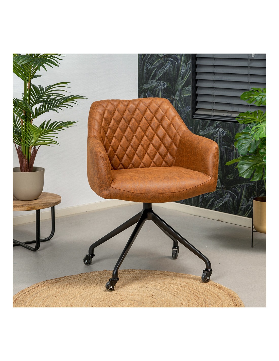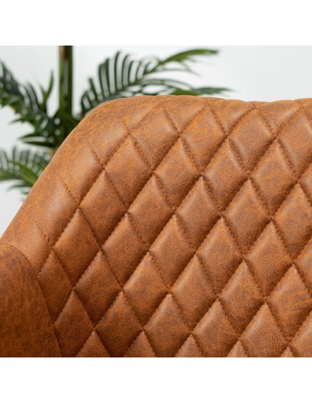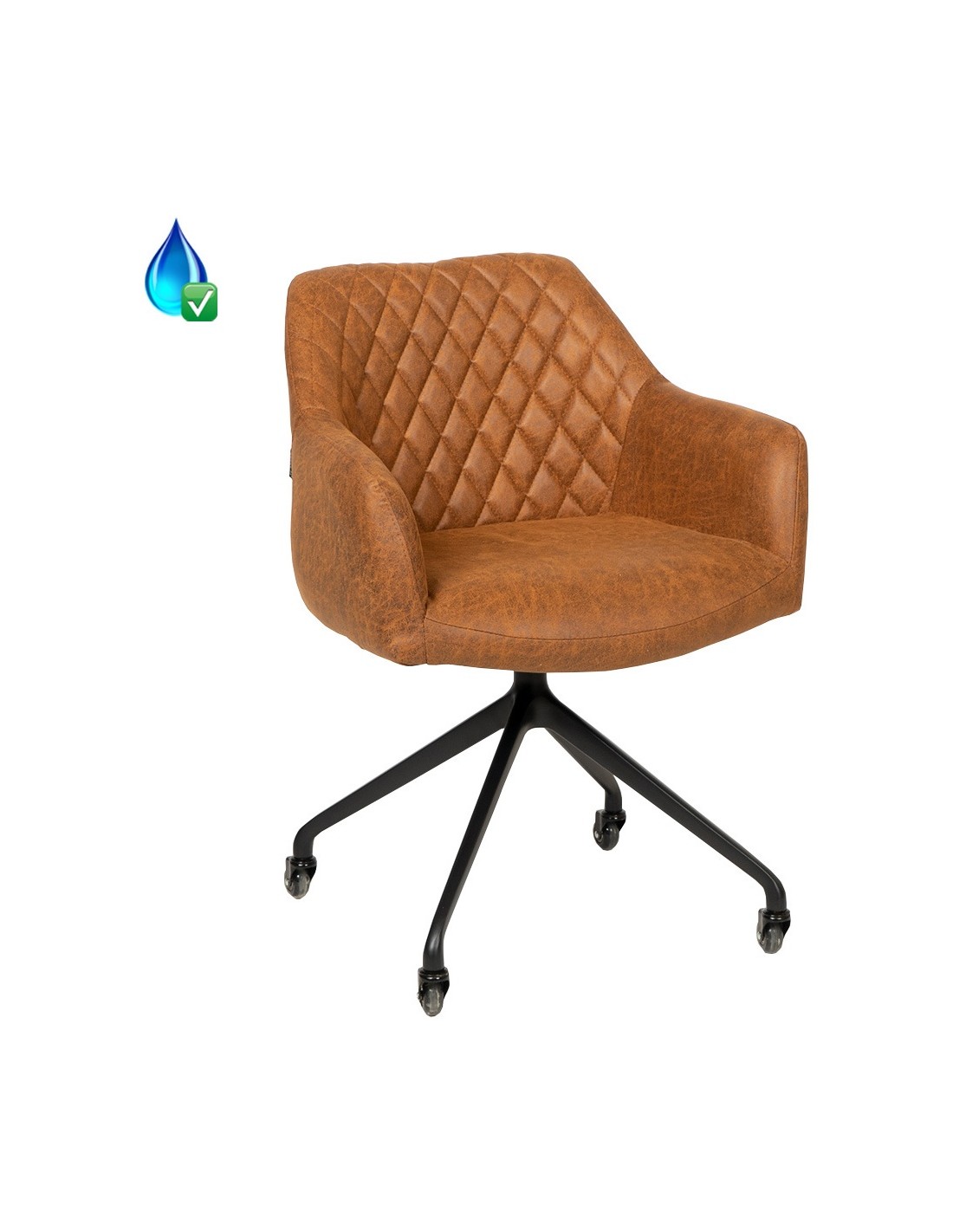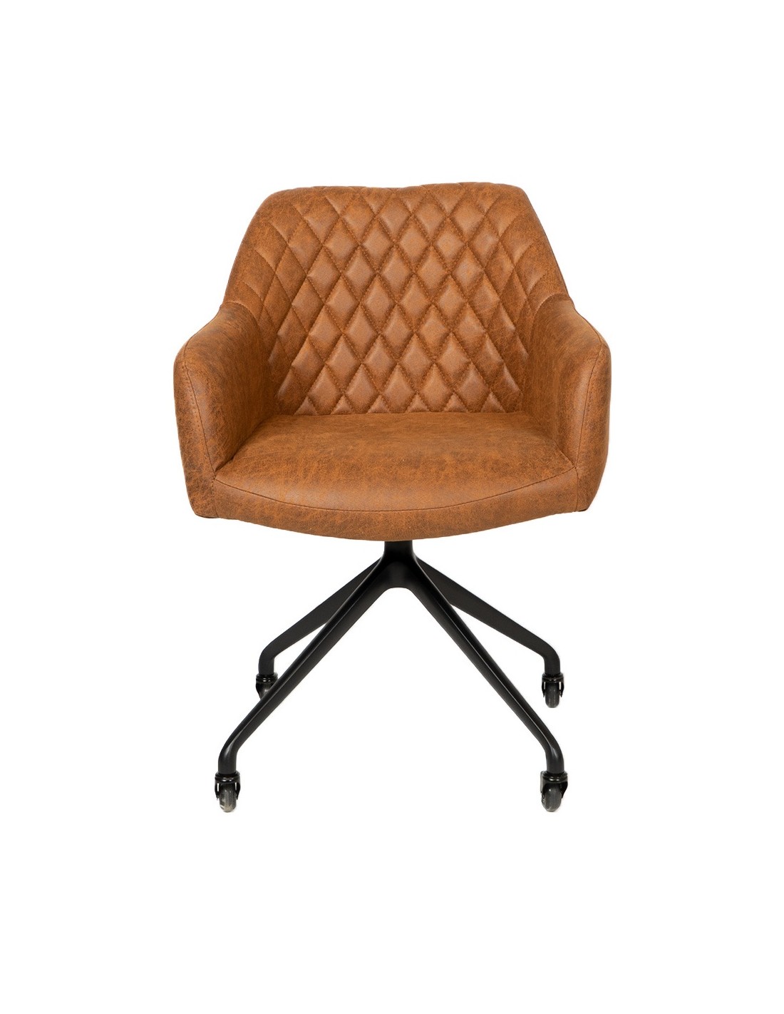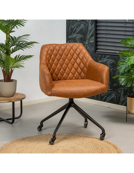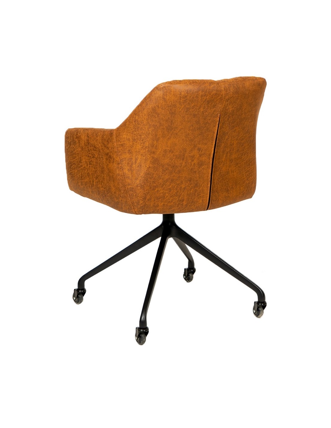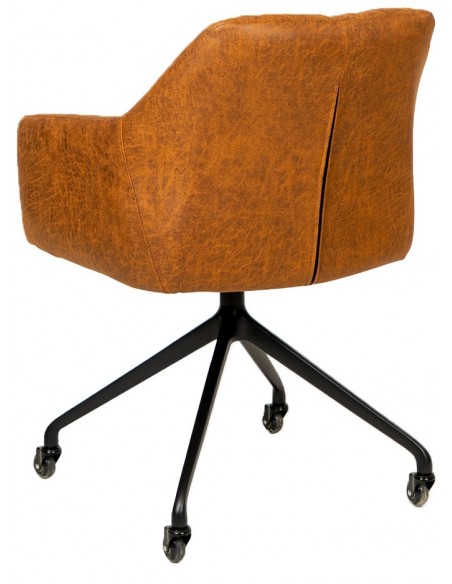 Levi kontorstol i et moderne design, fremstillet med sæde i vintage cognac øko-læder (70% Læder/30% Polyester) og stel i sortlakeret metal. Stolen måler 81 cm i højden over ryggen og med siddehøjde på 52 cm. Betrækket er med martindale 45.000 og er vandafvisende. Stolen er ikke med hejsefunktion.