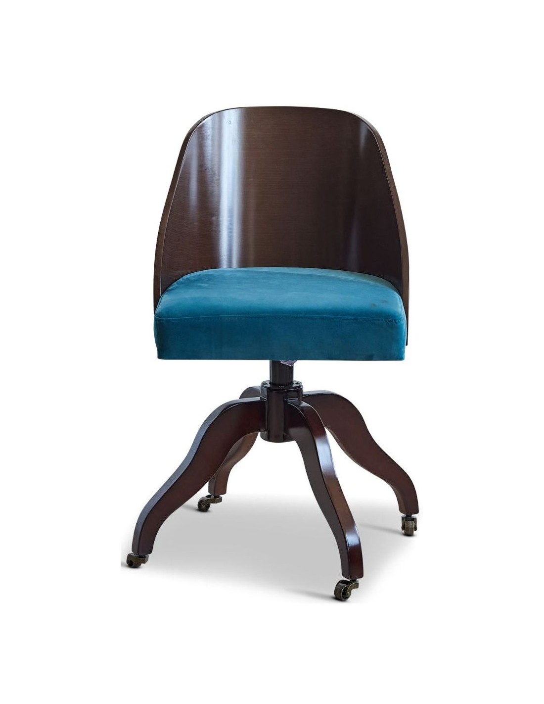 Kontorstol fra Authentic Models. Kontorstolen er udført i et design i vintage mørkebrun lakeret mahognitræ og grøn velour. Stolen måler 82 cm i højden og 42 x 45 cm i bredde og dybde.