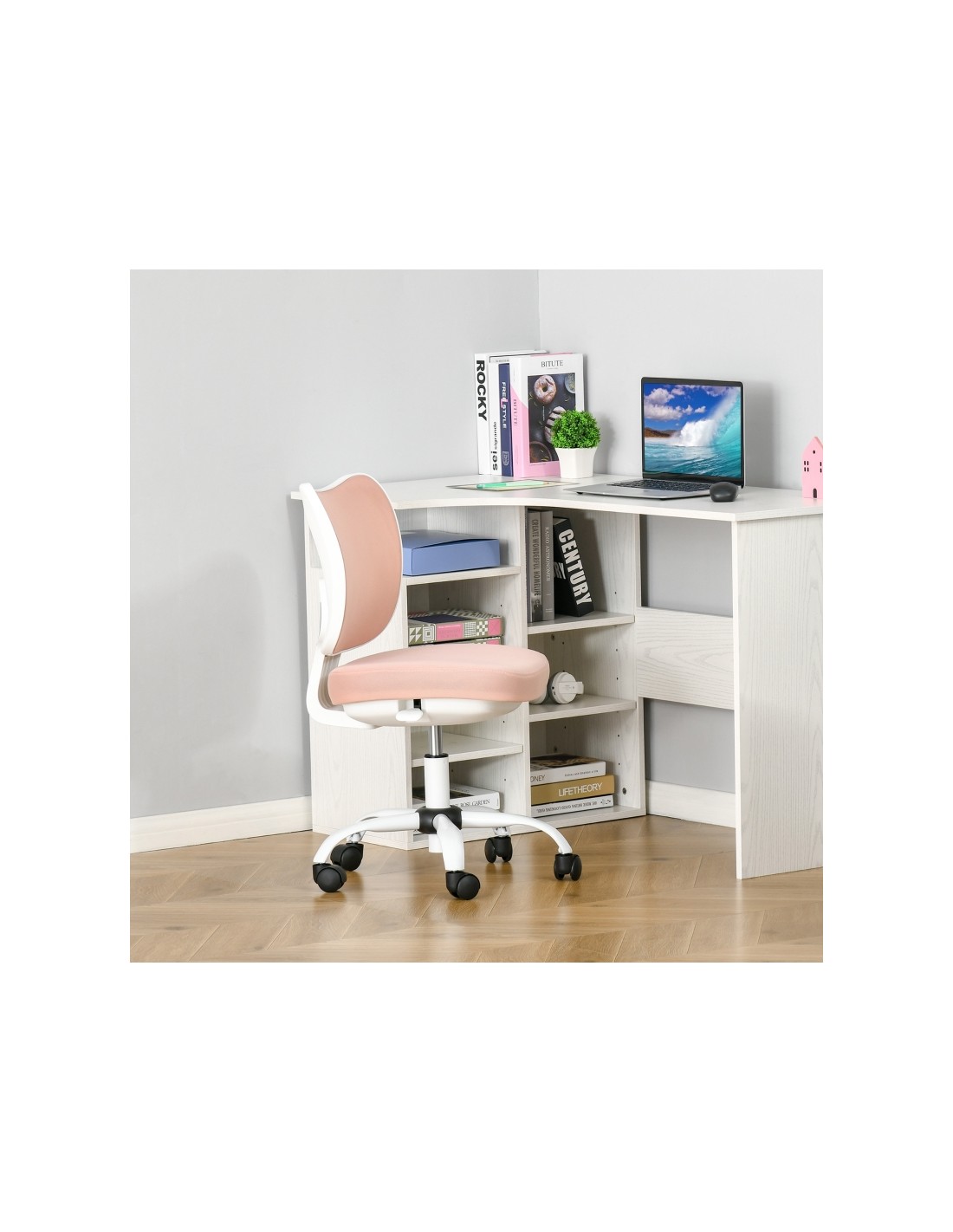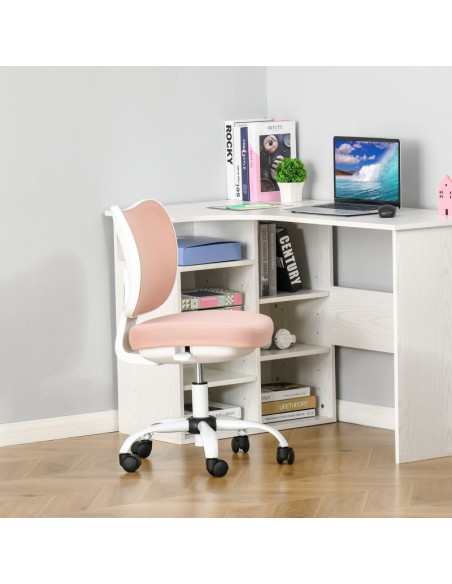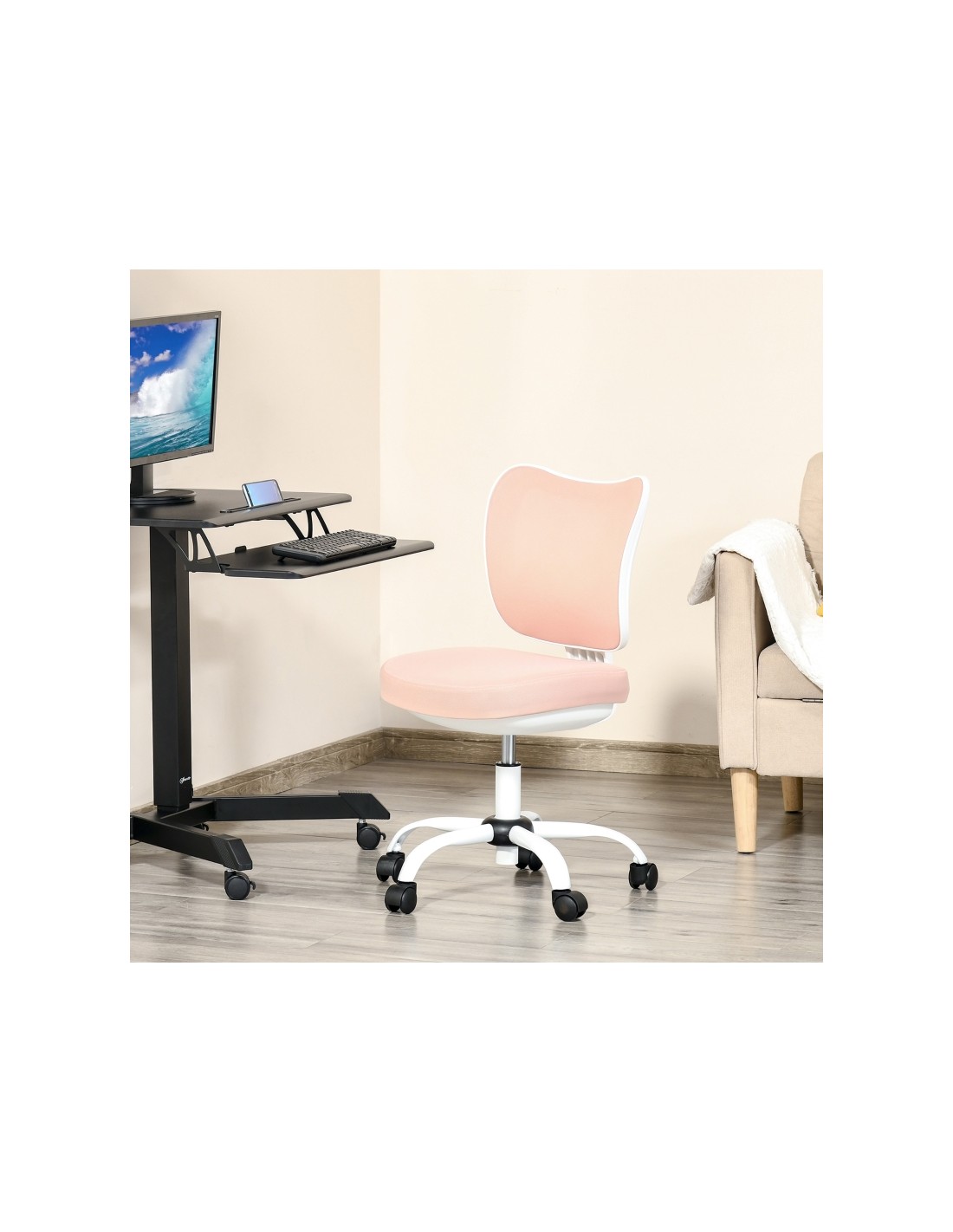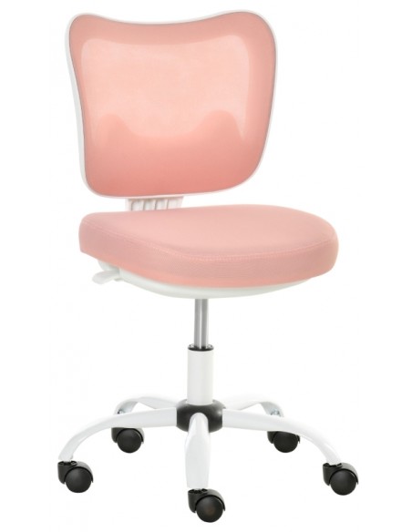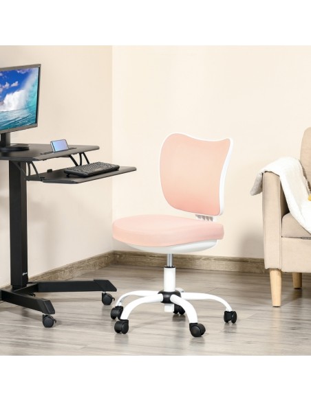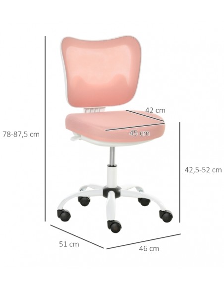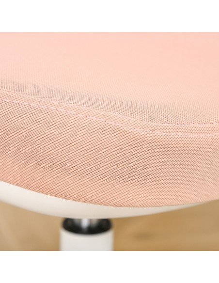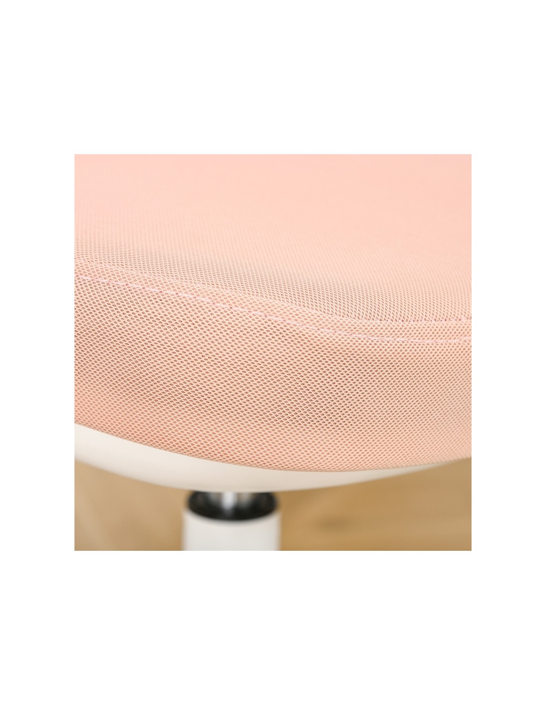 Kontorstol i et design af hvid kunststof og rosa polyester. Kontorstolen måler 78 - 87,5 cm i højden over ryggen og med en siddehøjde på 42,5 - 52 cm. Stolens bredde er 46 cm og dybde 51 cm.