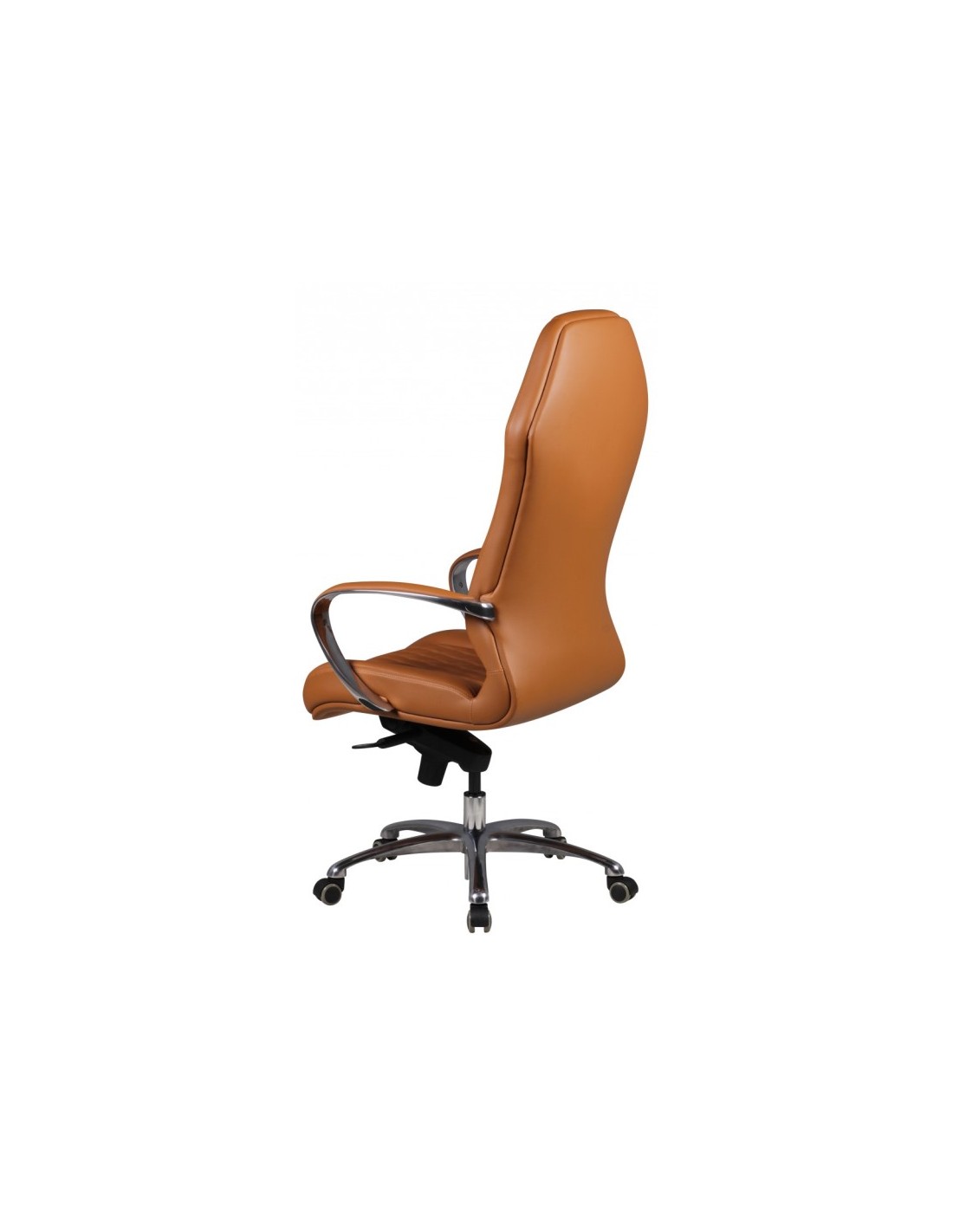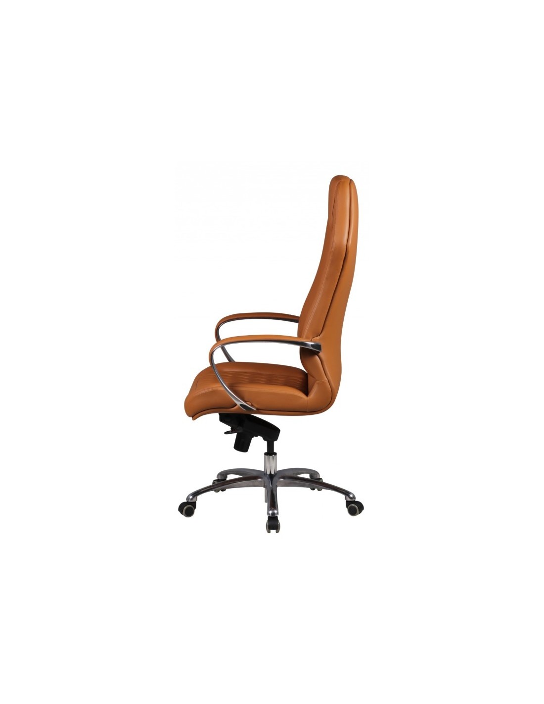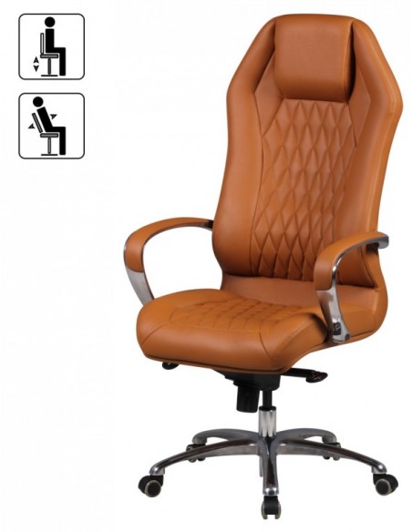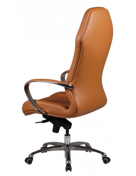 Kontorstol fremstillet i et design af kromlakeret metal og kamelbrun ægte læder. Kontorstolen måler 126 - 136 cm i højden over ryggen og med en siddehøjde på 50 - 60 cm.