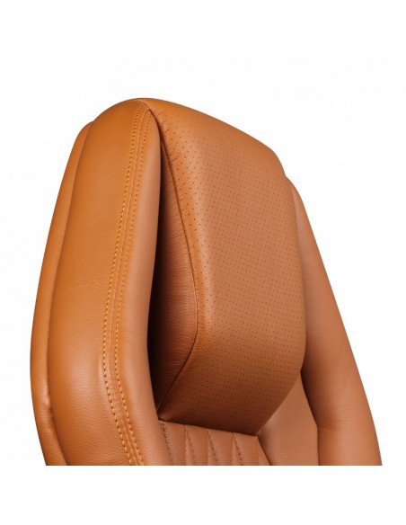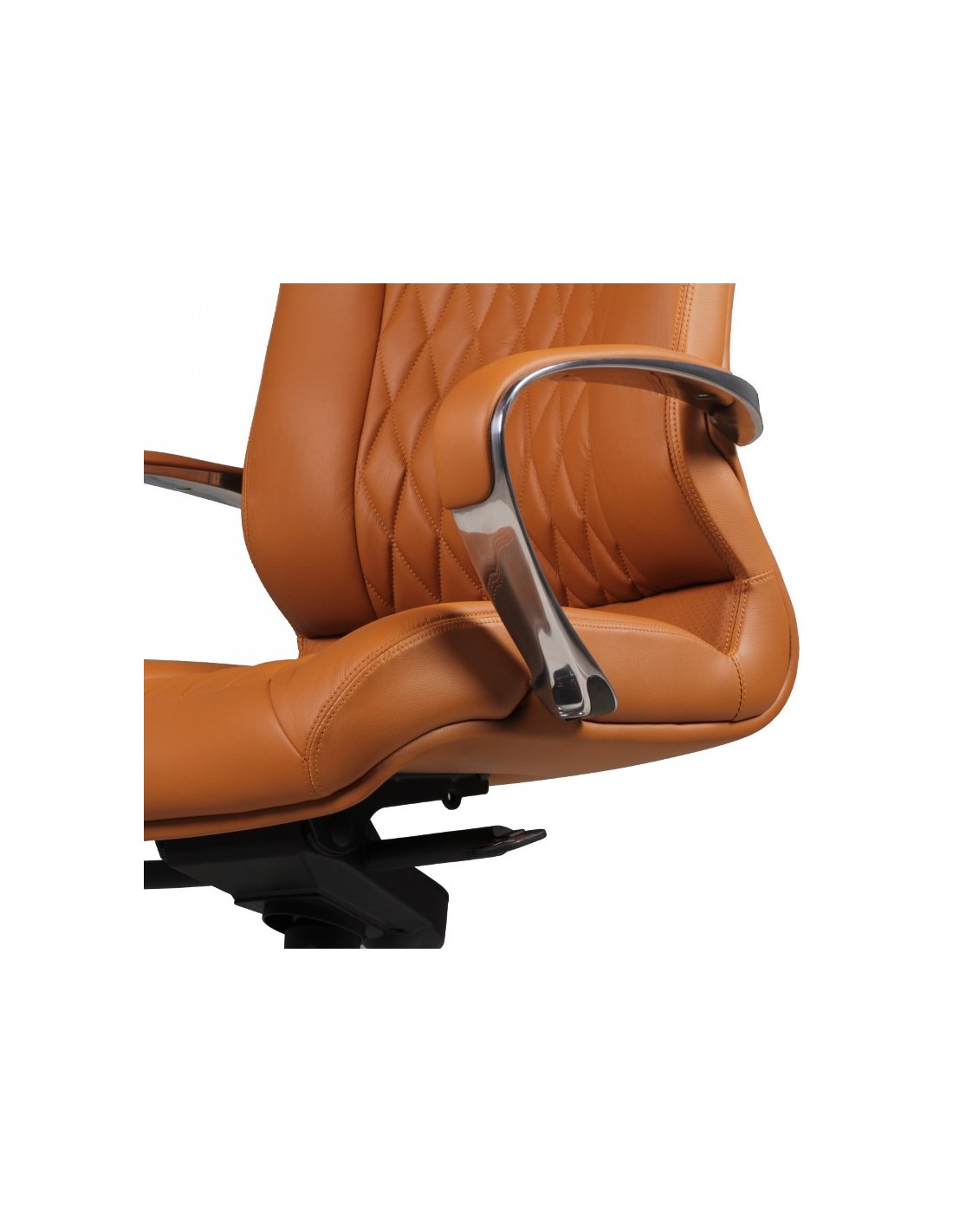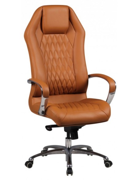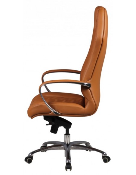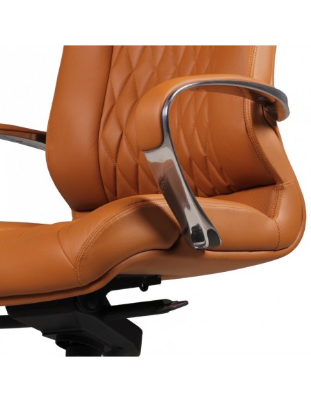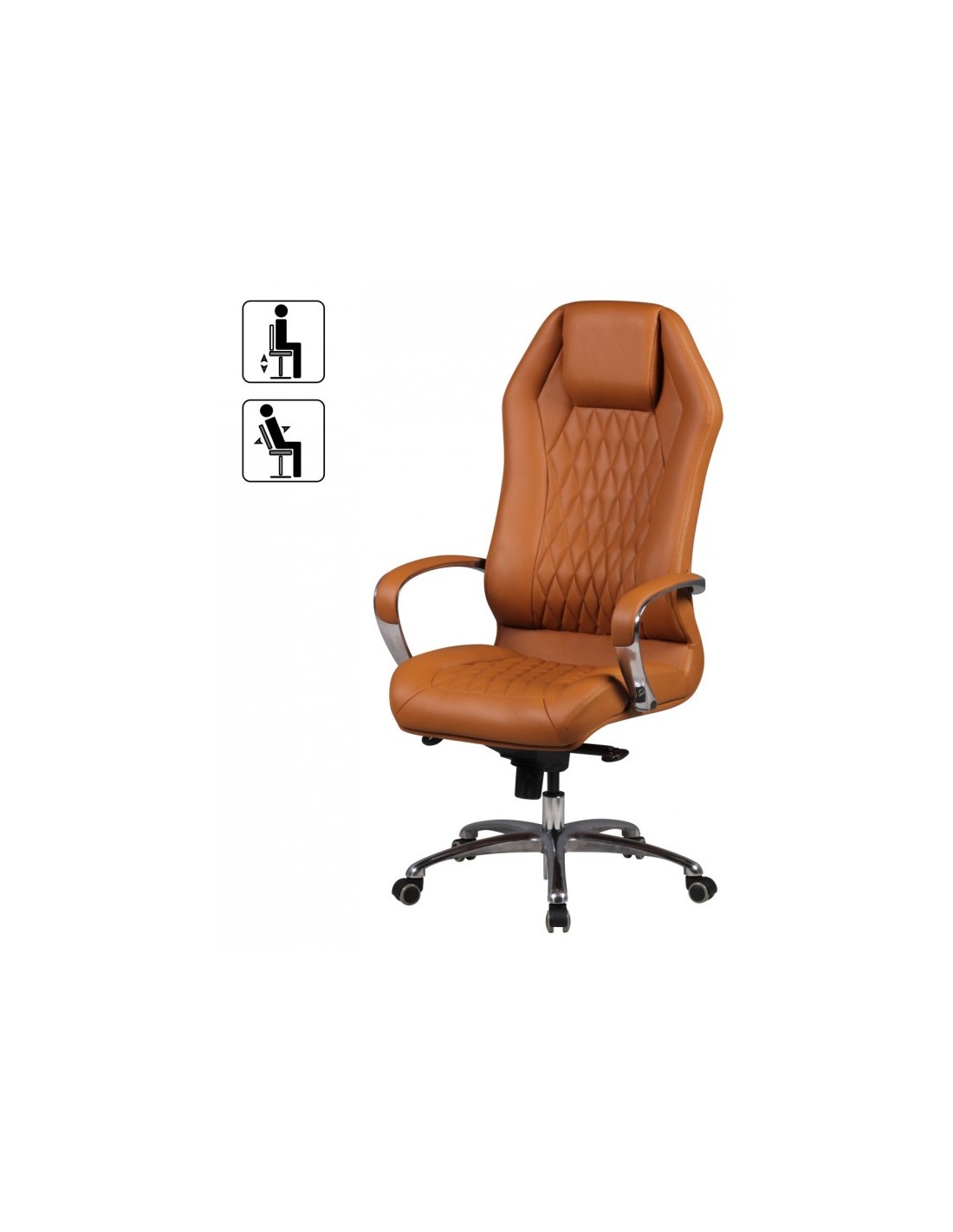 Kontorstol fremstillet i et design af kromlakeret metal og kamelbrun ægte læder. Kontorstolen måler 126 - 136 cm i højden over ryggen og med en siddehøjde på 50 - 60 cm.