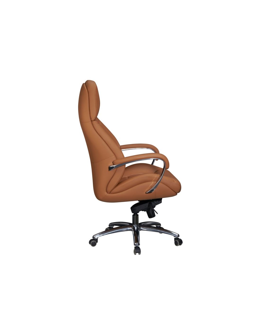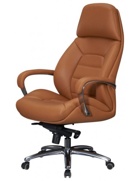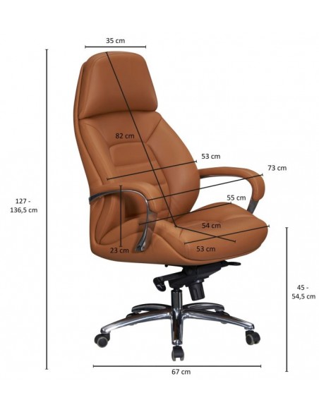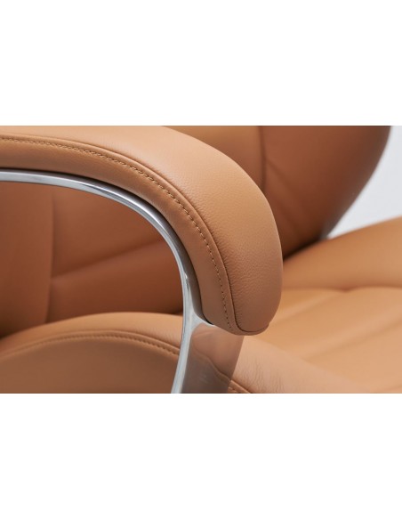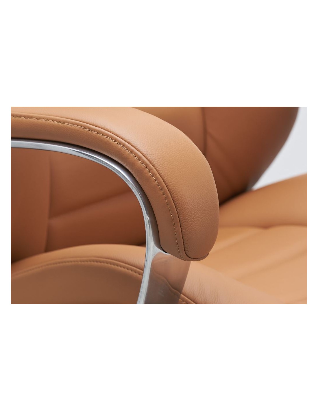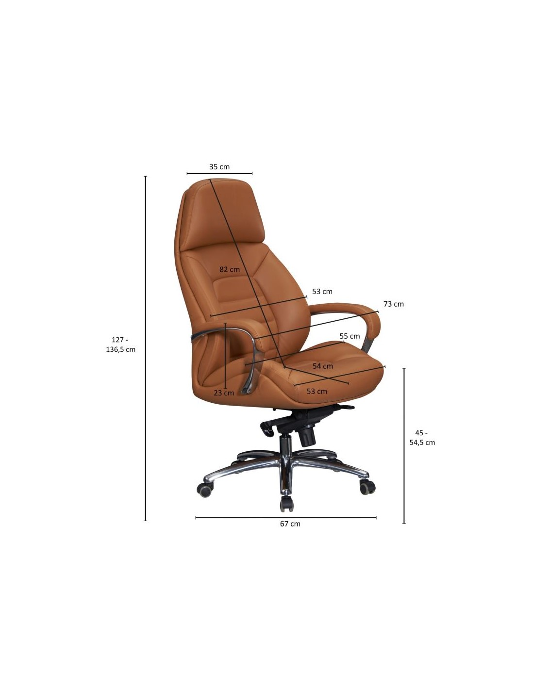 Kontorstol fremstillet i et design af kromlakeret metal og kamelbrun ægte læder. Kontorstolen måler 127 - 136,5 cm i højden over ryggen og med en siddehøjde på 45 - 54,5 cm.