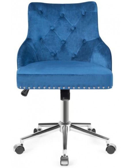 Kontorstol udført i et design af kromlakeret metal og blå velour. Bordet måler 84 - 98 cm i højden over ryggen og 51 - 65 cm i siddehøjden.