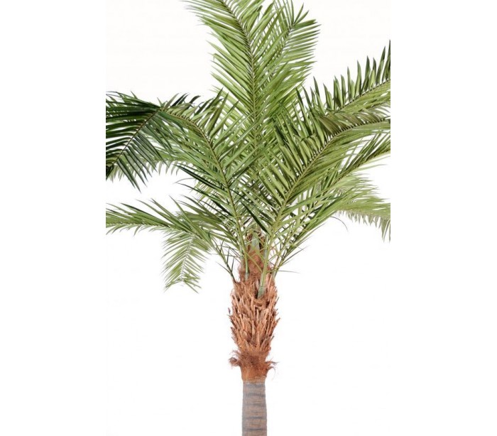 Stor kunstig palme i et smukt fremstillet design, med en højde på cirka 380 cm. Træet har mange blade og en naturtro stamme. Træet skal fastgøres til gulv, af hensyn til sikkerhed.