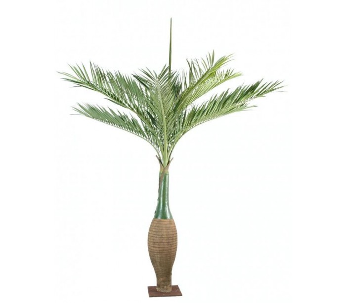 Stor kunstig palme i et smukt fremstillet design, med en højde på cirka 350 cm. Træet har mange blade og en naturtro stamme. Træet skal fastgøres til gulv, af hensyn til sikkerhed.