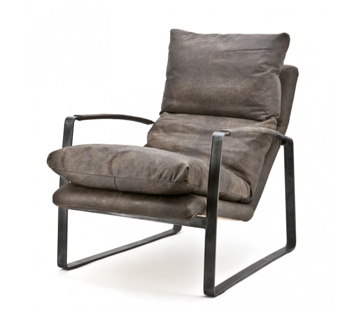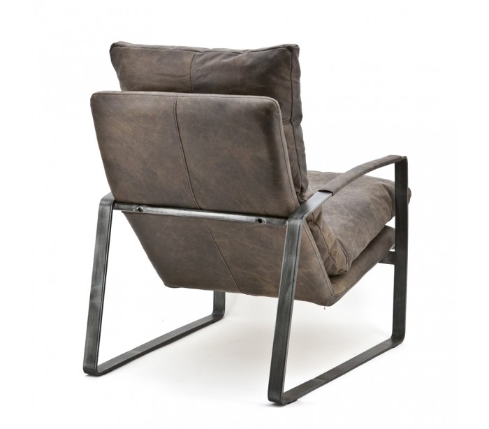 Lænestol med armlæn i et rustikt design af mørkebrunt læder. Stolens stel er fremstillet af lakeret metal. En stol der vil matche både den moderne, såvel som den klassiske indretning. Stolen måler 94 cm i højden, over ryggen, og har en siddehøjde på 45 cm.