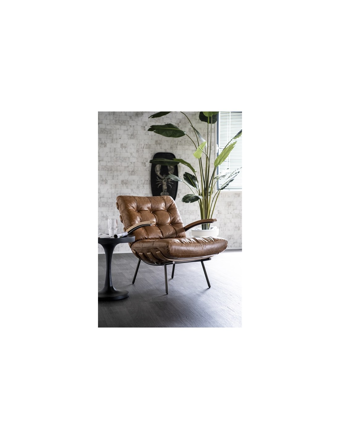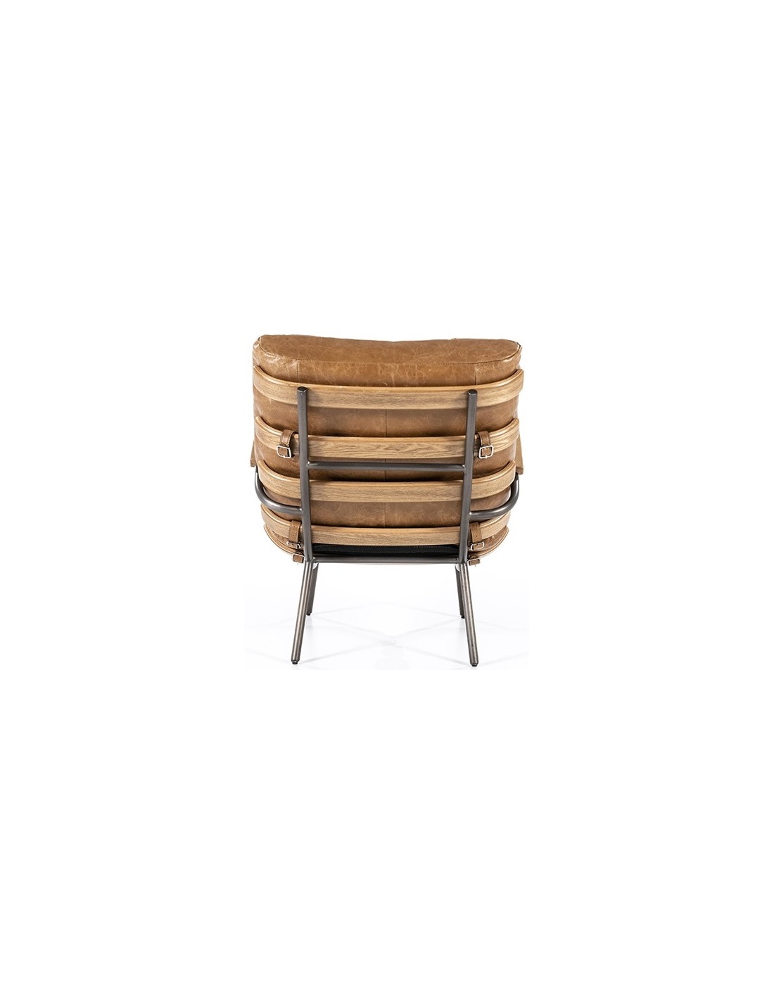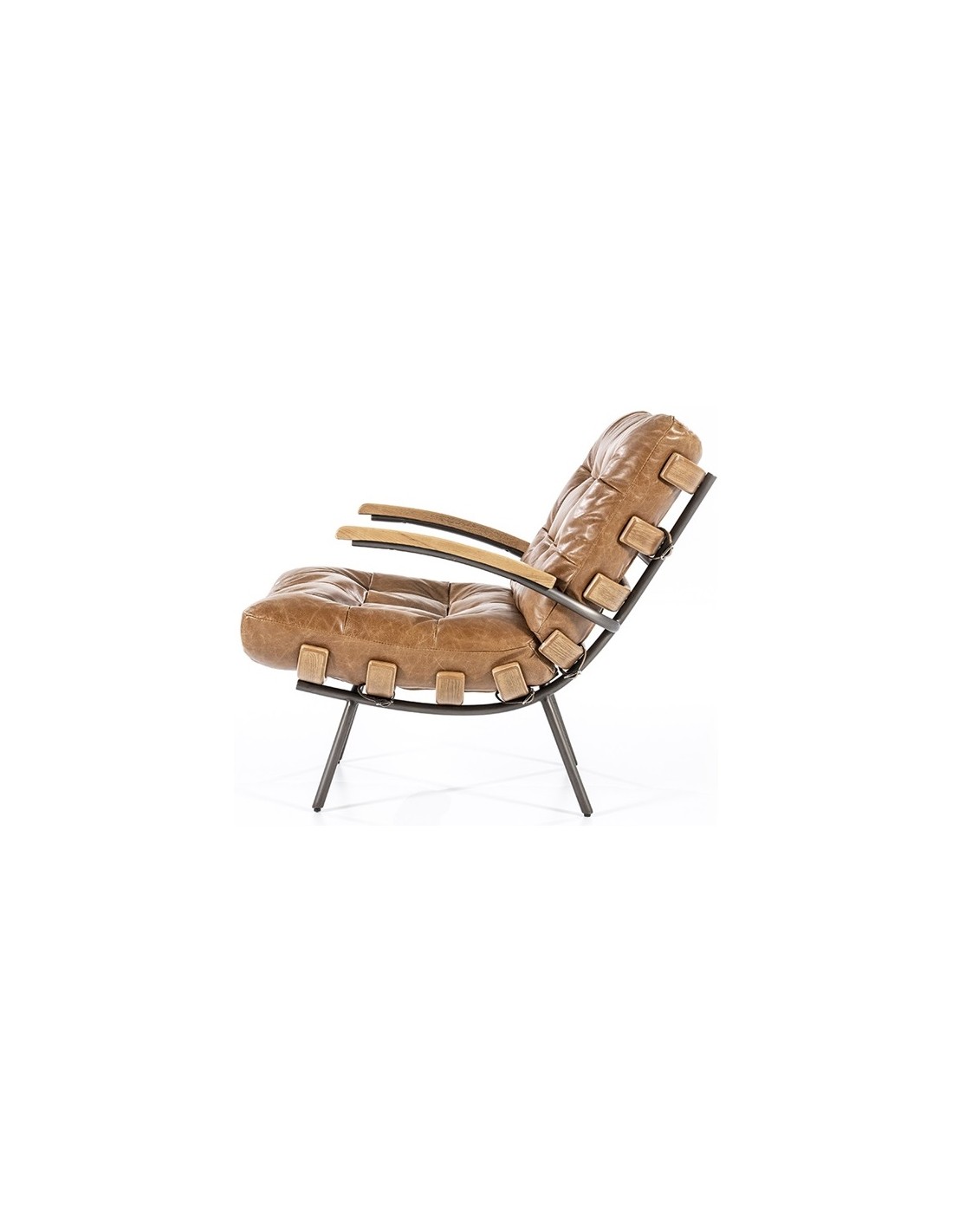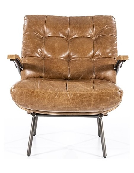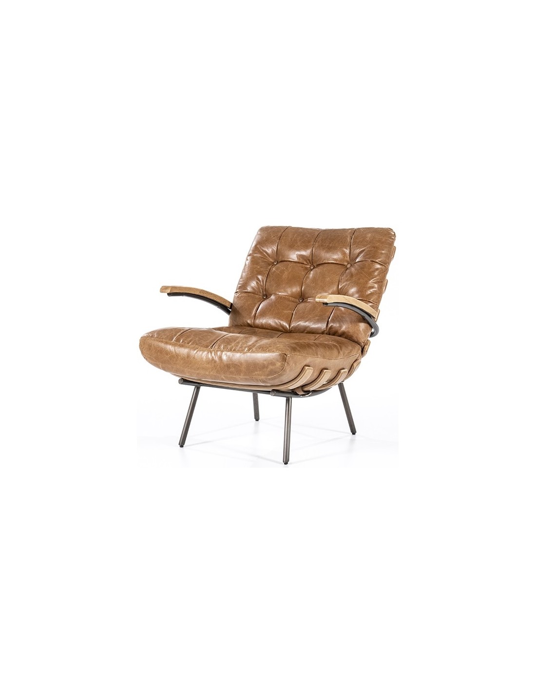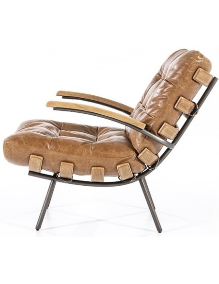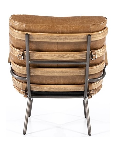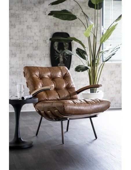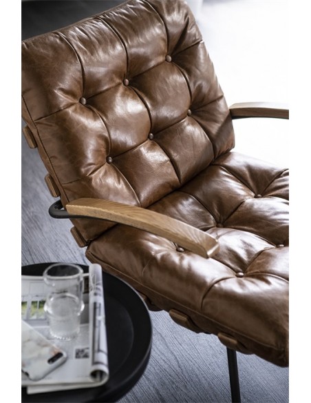 Lænestol i et moderne design, fremstillet med stel i naturfarvet egetræ og stel i sortlakeret metal. Sædet er fremstillet i ægte læder. Stolen måler 80 cm i højden over ryggen og har en siddehøjde på 40 cm.