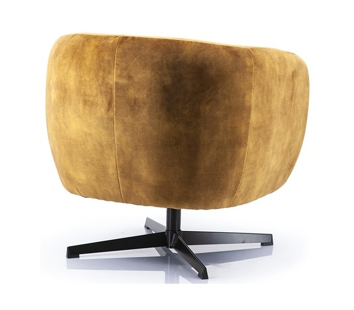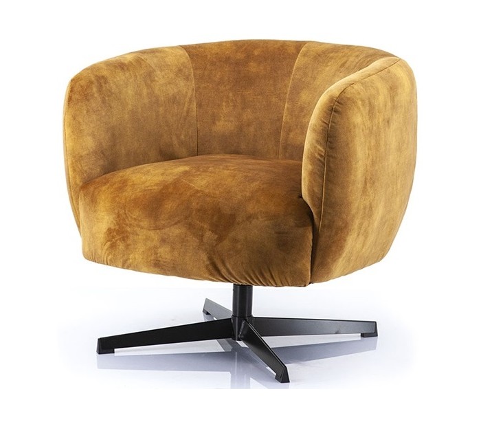 Lænestol i et moderne design, fremstillet i okkerfarvet polyester med coating (føles som ruskind) og med stel i sortlakeret metal. Stolen måler 75 cm i højden og 77 cm i bredden og er rotérbar i stellet.