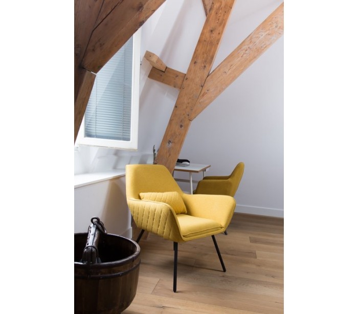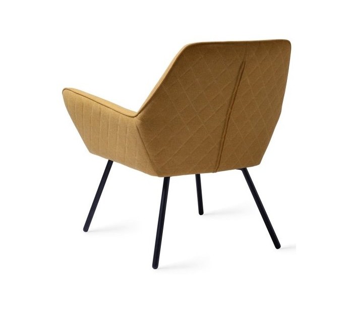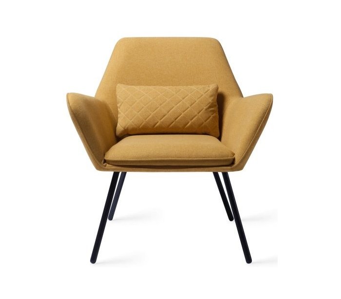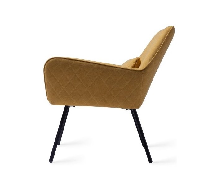 Sanno lænestol i et moderne design, fremstillet i sennepsgul polyester og stel i sortlakeret metal. Lænestolen måler 80 cm i højden over ryggen og med siddehøjde på 44 cm.