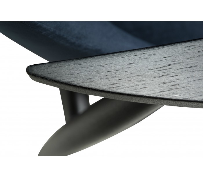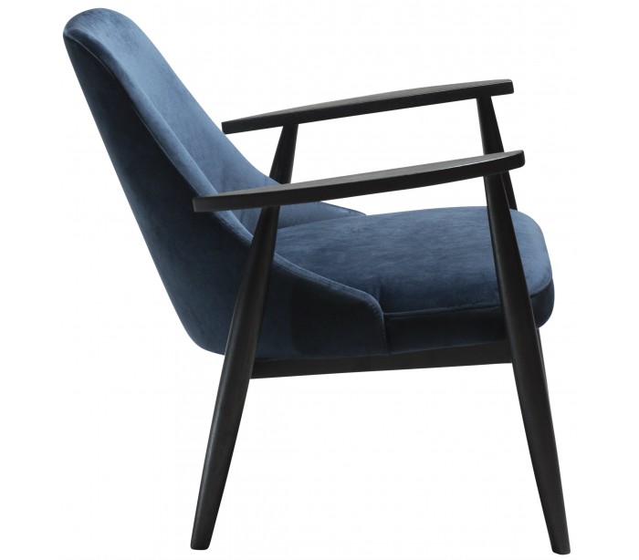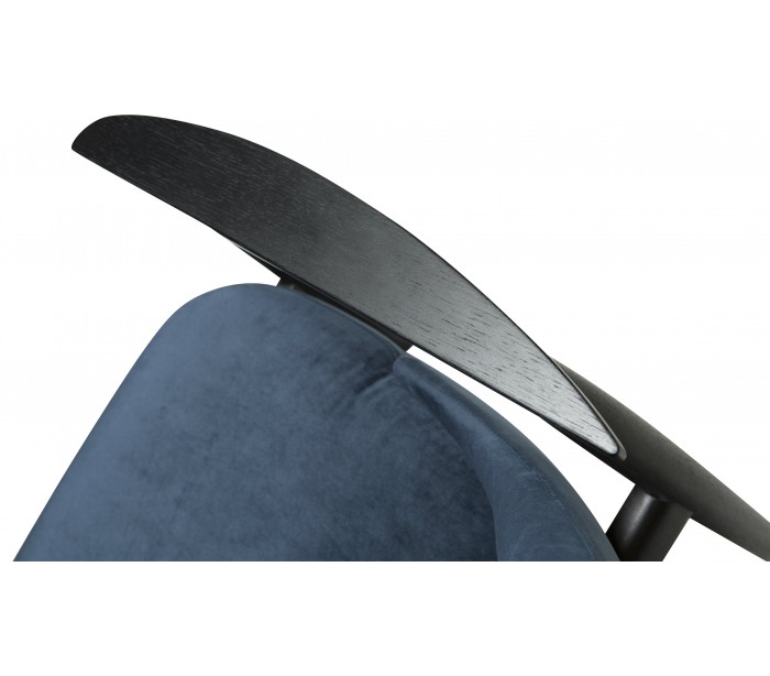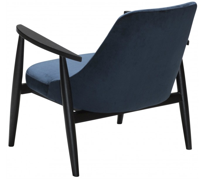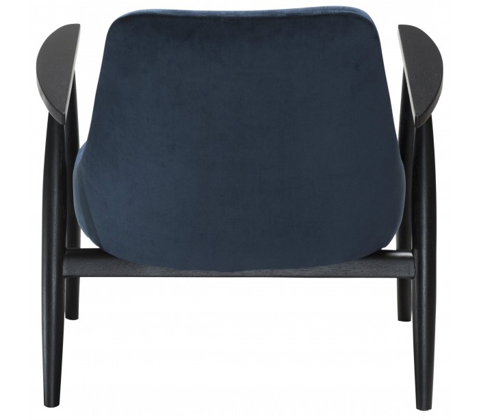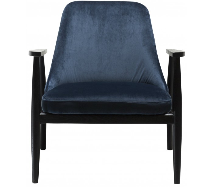 Loungestol i et smukt design, fremstillet med sæde i midnatsblå velour og ben i sortbejset ask træ. Loungestolen måler 73 cm i højden over ryggen og 40 cm i siddehøjde.
