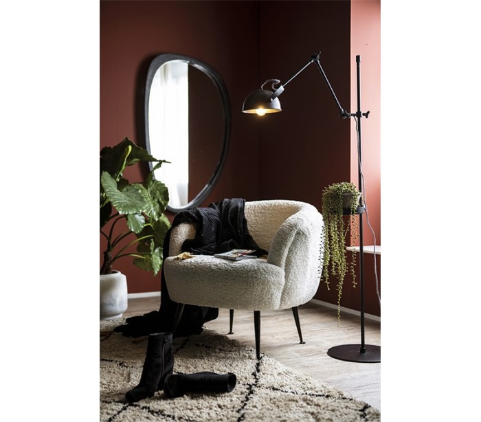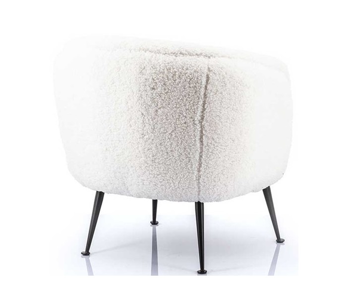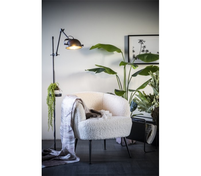 Lænestol i et moderne design, fremstillet i hvid plysset polyester og med ben i sortlakeret metal. Stolen måler 71 cm i højden og med siddehøjde på 48 cm.