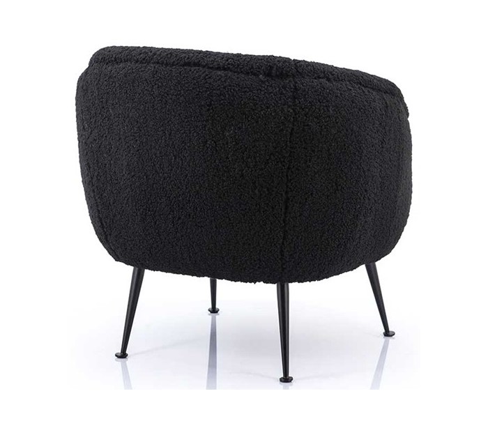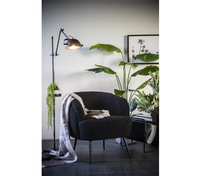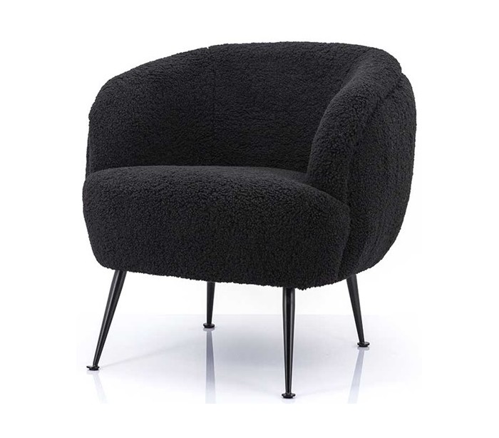 Lænestol i et moderne design, fremstillet i sort plysset polyester og med ben i sortlakeret metal. Stolen måler 71 cm i højden og med siddehøjde på 48 cm.