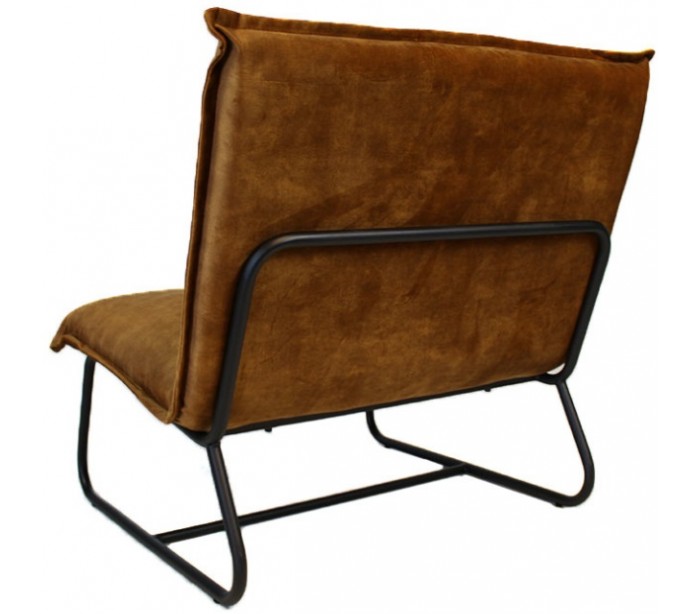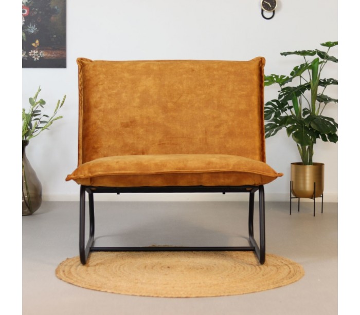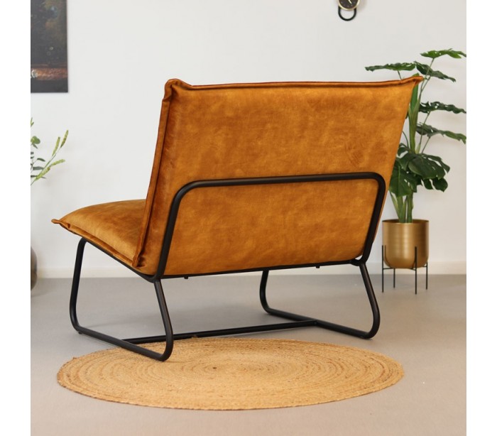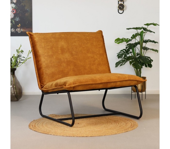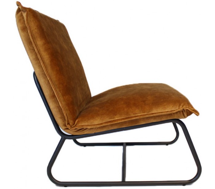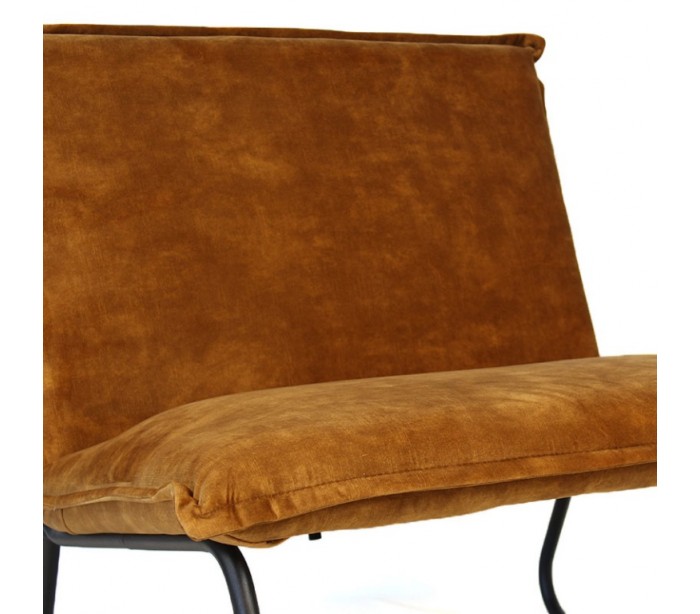 Paris lænestol i et design af okkerfarvet velour og med stel i sortlakeret metal. Stolen måler 83 cm i højden over ryggen og med siddehøjde på 45 cm. Velouren er vandafvisende og med martindale på 100.000, som gør stolen særligt anvendelig i restaurationer med flere.